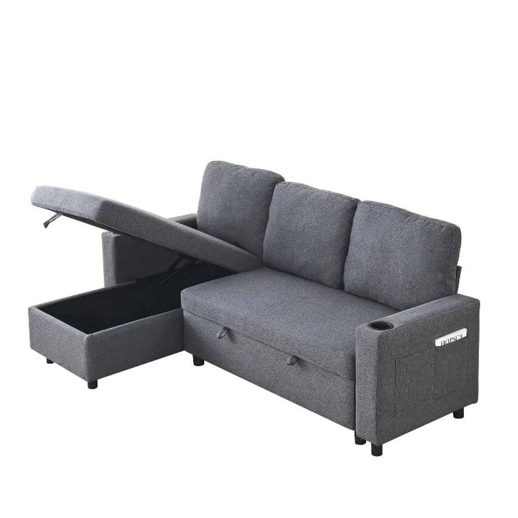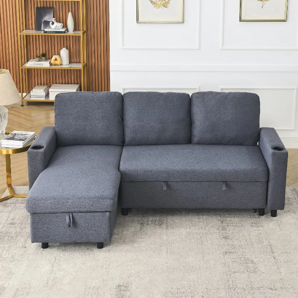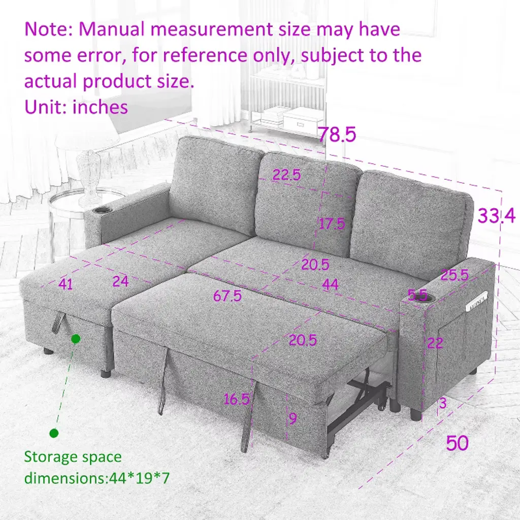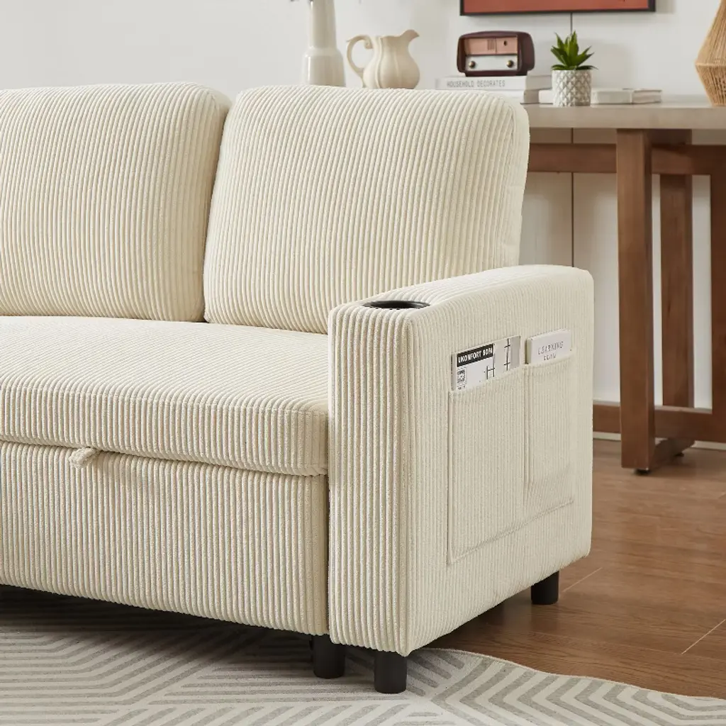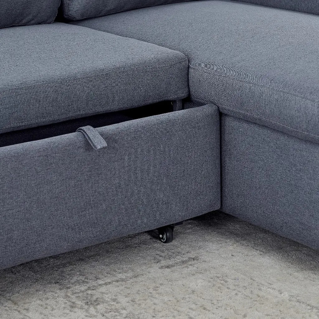 ✔ MODERN SOFA: Upholstered modern sofa designed with soft fabrics that can be arranged and reconfigured in a variety of ways for spacious small or large living rooms to fit different spaces. ✔ CONVERTIBLE DESIGN: This sofa set includes a left corner seat and a right corner seat. The upholstered seat of the sofa can be on the right or left side. You can choose the position and shape according to your preference. ✔ QUICK CONVERTIBLE TO SLEEPING BED: The sofa bed end pull-out drawer style, equipped with portable handles, with the help of the bottom pulley device to quickly complete the conversion of the bed. It can meet your various needs and never have to worry about the arrival of uninvited guests. ✔ COMFORTABLE SEATING CUSHION: Our sofa is upholstered with comfortable high-density foam cushions for ultimate comfort and support. Optimal softness and super soft cushions make the sofa give a relaxing feeling. ✔ PERFECT STORAGE SPACE: This sectional sofa with storage toffee chair will add the perfect touch to your den or living room. The convenient space on the storage toffee chair is the perfect place for blankets and magazines. The armrests have cup holders and the side storage pockets hold remote control boards or books.