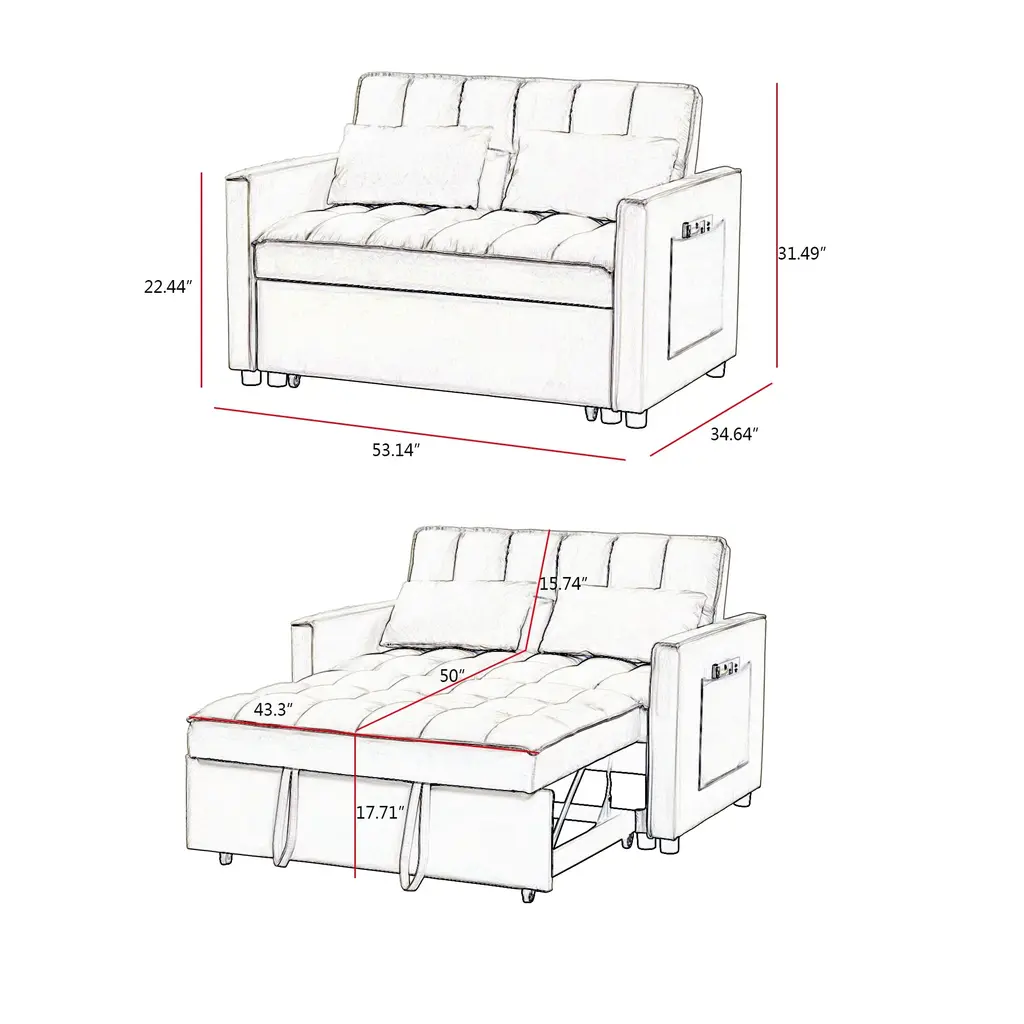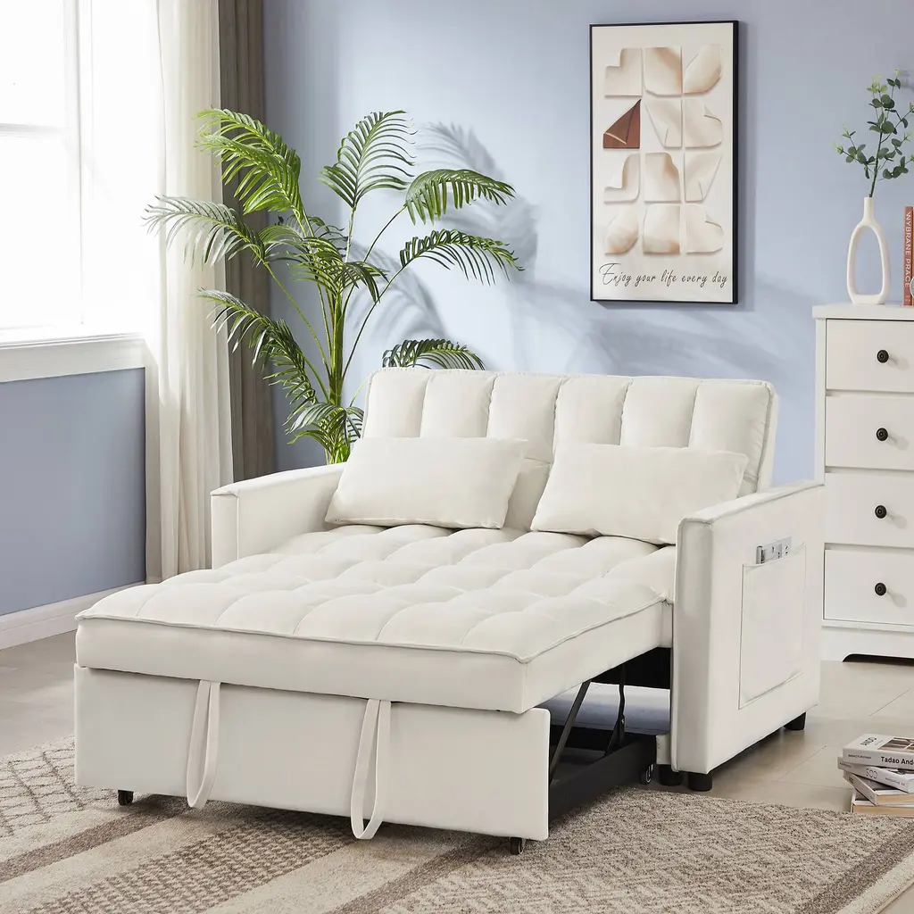 Velvet Tufted Loveseat Couch Convertible Sleeper Sofa Bed Small Love Seat Lounge Sofa With Pillows And Side Pockets - Off White