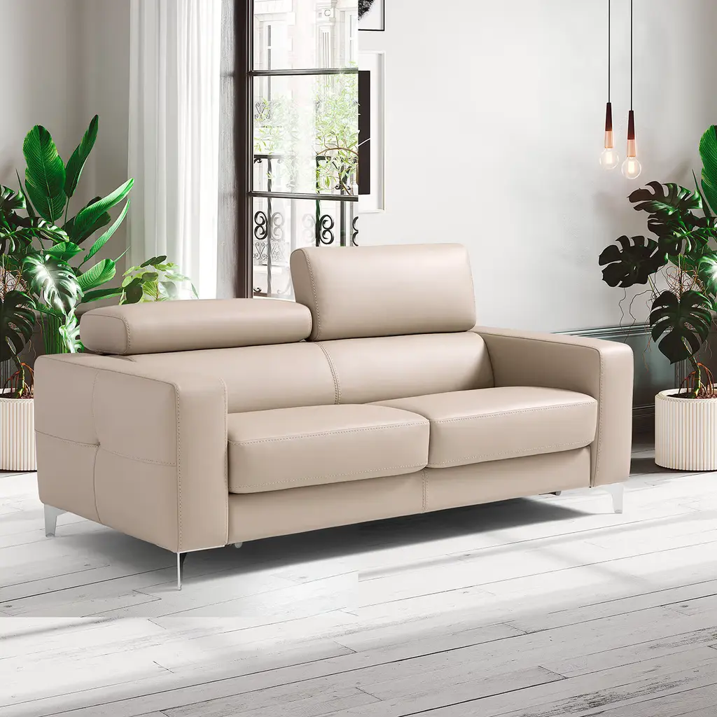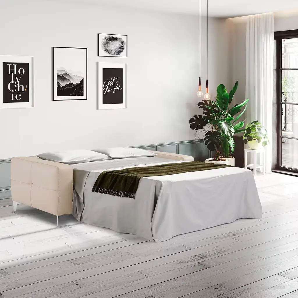 Raised on luminous and compact metal feet, this sofa bed is the epitome of modern style and impeccable comfort. Subtle quilted details add aesthetic appeal to the smooth, beige-toned leather upholstery, which increases the comfort provided by the plush seat, armrests, and backrest equipped with adjustable headrests. Electro-welded mesh, memory foam mattress, and a compartment for pillows complete the design. A variety of colors and sizes are available, please inquire with the Concierge for details.
