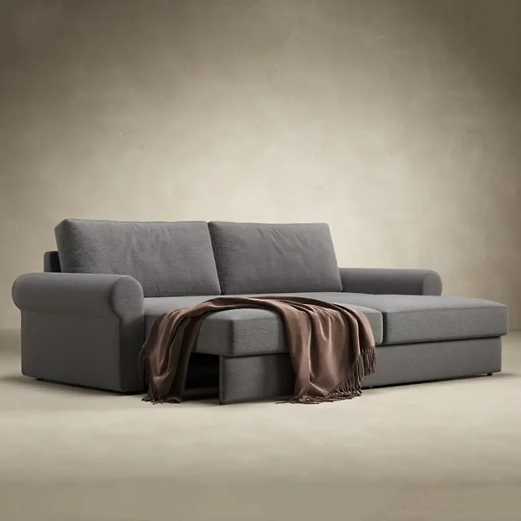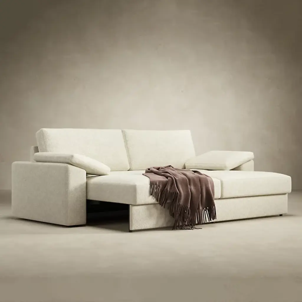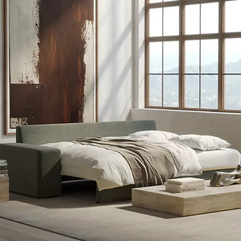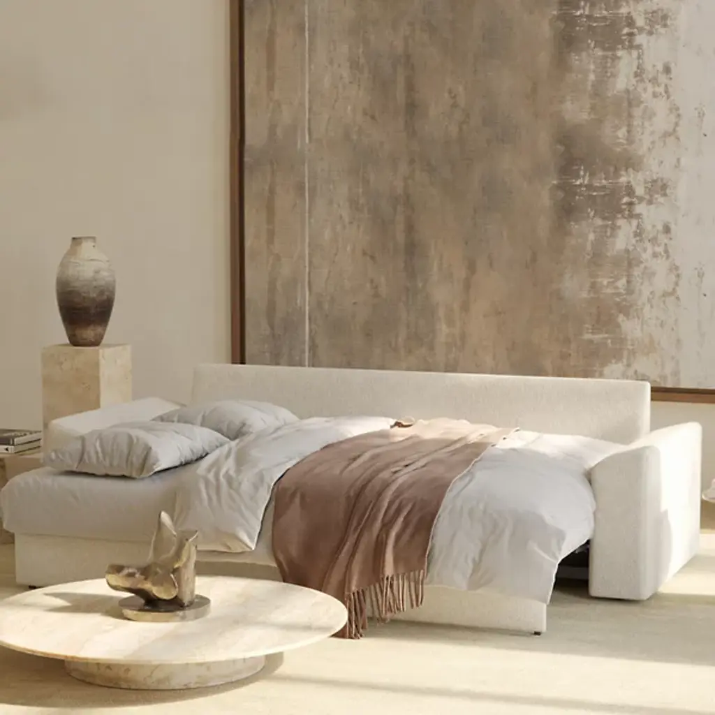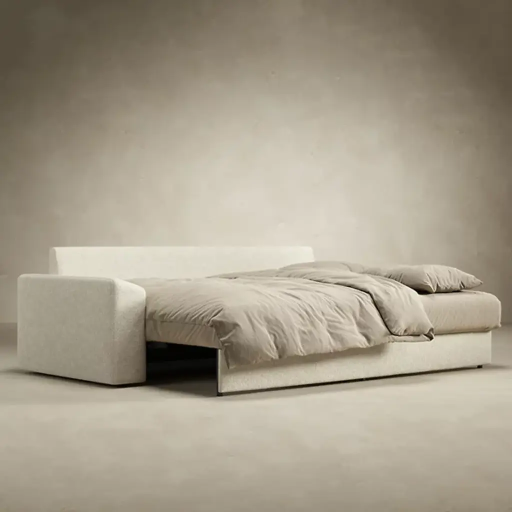A multi-function creation complete with automatically folding legs, the Vilander Sofa Bed from Innovation Living provides smooth Contemporary character. A Per Weiss design made in Denmark, its matte black steel frame is strong and supportive, able to shift easily from a three-seat sofa to a full-sized bed or lounger. Equipped with double-spring upholstery, it embeds no-zag and pocket springs within plush foam. The polyester and acrylic upholstery blend sheathes cushions and padding in a final element of comfort.