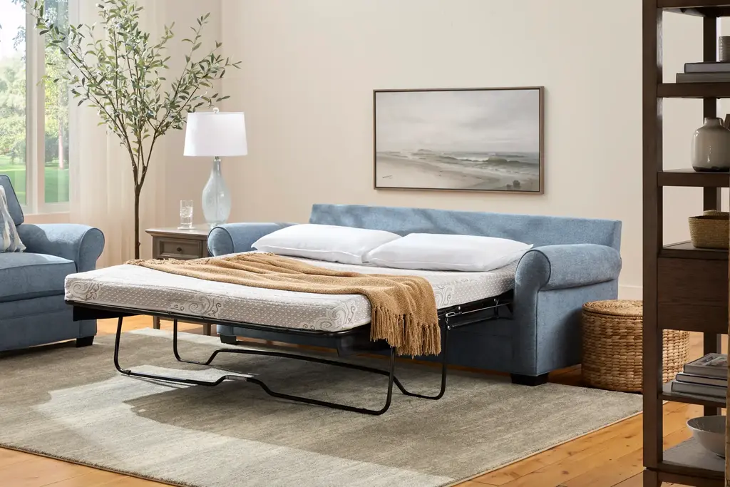Grace your living room with the classic comfort and timeless style of the Wellesley reversible sofa chaise with sleeper. You simply can't go wrong with the gently rolled arms, tailored piping, and plush loose cushions for a relaxed yet refined feel. The Wellesley blends traditional charm with everyday ease and, when you need a bit of extra sleeping space, it opens to a comfy memory foam mattress that's sure to please.
