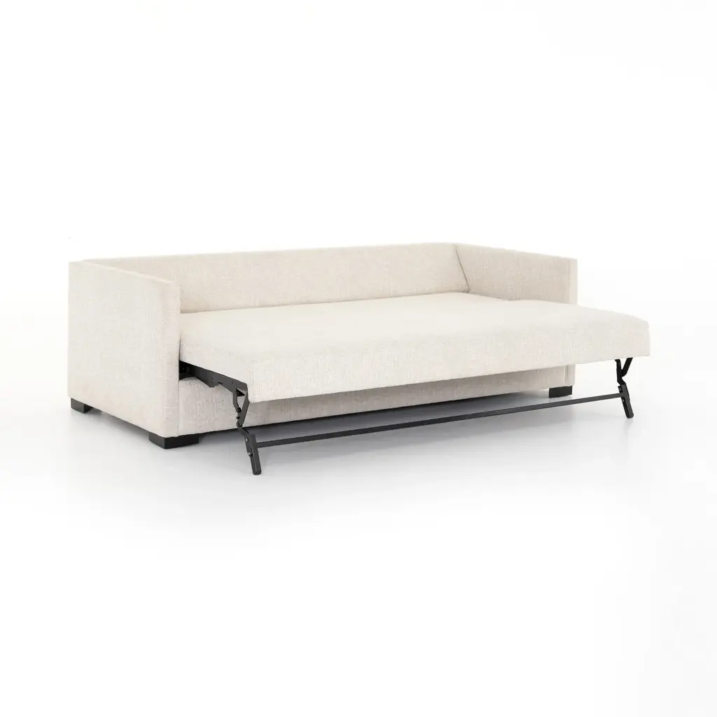 Indulge in ultimate luxury with the Wickham Sleeper Sofa from Four Hands. Its simple yet stylish silhouette, knife-edge pillows, and high-performance upholstery elevate this classic sofa bed to new heights. The discreetly concealed sleeper mechanism allows for easy one-step pullout, while the unfolded sofa cushions create a comfortable Queen-size bed. Perfect for overnight guests or cozy movie nights. No need for an extra mattress. Highlights