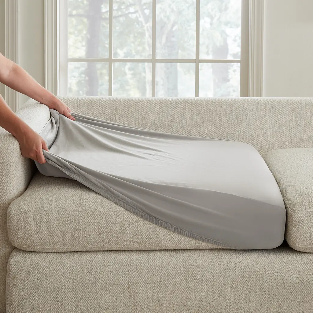 SureFit Hampstead Stretch Velvet Slipcover Extra-Long Sectional Cushion Cover - the ultimate style and durability solution for your sofa cushions. Carefully crafted with meticulous attention to detail, this cushion cover effortlessly combines comfort and practicality. Specifically designed to snugly fit extra long furniture cushions ranging from 30" to 48" wide and 60" to 80" long, our cover envelops your cushions in a luxurious embrace of soft plush velvet. Enhancing your living space, the two-way stretch knit fabric ensures a seamless fit for a variety of cushion shapes, whether attached or removable. The ingeniously placed elastic at the cushion opening guarantees a secure hold, preventing any unwanted shifting while maintaining a polished appearance. Installing this cover is a breeze, and the stretchy fabric effortlessly adapts to your cushion's unique contours. Made from a blend of 92% Polyester and 8% Spandex, this cushion slipcover not only exudes quality but also simplifies maintenance with its machine-washable feature.