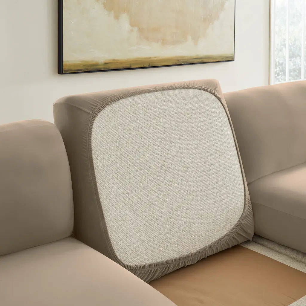 SureFit Hampstead Stretch Velvet Slipcover Extra-Long Sectional Cushion Cover - the ultimate style and durability solution for your sofa cushions. Carefully crafted with meticulous attention to detail, this cushion cover effortlessly combines comfort and practicality. Specifically designed to snugly fit extra long furniture cushions ranging from 30" to 48" wide and 60" to 80" long, our cover envelops your cushions in a luxurious embrace of soft plush velvet. Enhancing your living space, the two-way stretch knit fabric ensures a seamless fit for a variety of cushion shapes, whether attached or removable. The ingeniously placed elastic at the cushion opening guarantees a secure hold, preventing any unwanted shifting while maintaining a polished appearance. Installing this cover is a breeze, and the stretchy fabric effortlessly adapts to your cushion's unique contours. Made from a blend of 92% Polyester and 8% Spandex, this cushion slipcover not only exudes quality but also simplifies maintenance with its machine-washable feature.
