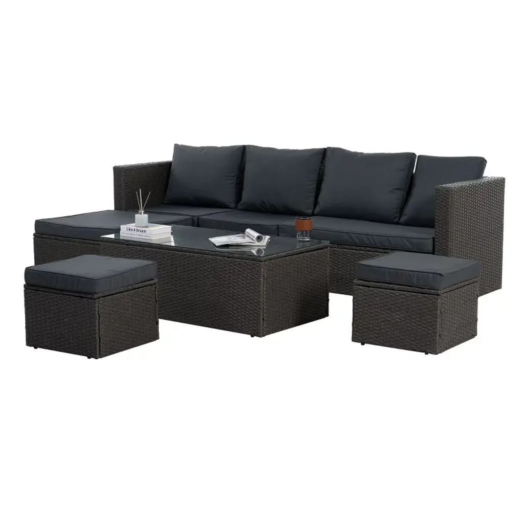 If you're looking for some patio furniture set to enjoy relaxing time with your family, our 7 piece furniture set might just be the ones for you. Made of selected anti-rust coated steel frames and weather-resistant wicker, no special maintenance,Foam-filled cushions with polyester-blend covers top each seat. No doubt it would be perfect for your poolside, garden,deck and other outdoor space. Just put your favorite cushions to the sofas to make it more colorful and comfy~ We believe that you will have fun in all circumstances with our patio set. (The cushion can against droplets, but please don't leave them alone in the rain!)