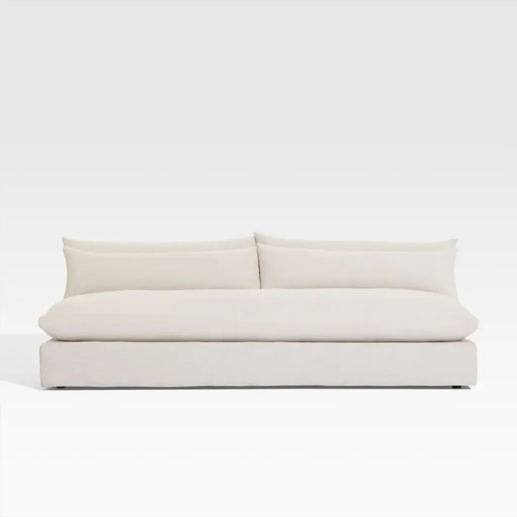 Refresh the easy, breezy look of your Seascape sofa with custom replacement cushions. The set comprises extra-plush seat and pillowy back cushions, and two scrunchable throw pillows, all upholstered in an ivory linen-like outdoor fabric. A replacement slipcover is also available.