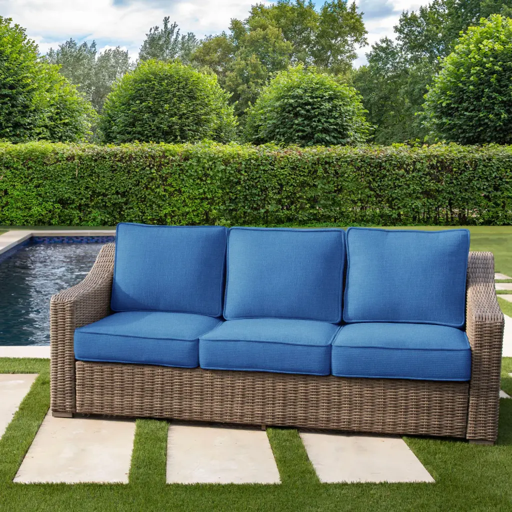 Supreme comfort and a beautiful shade of blue mark the selling points of this beautiful outdoor sofa cushion set with a fabric solid textured. Enjoy the soft, durable feel of remarkable outdoor fabric that stands up to weather and sun to resist fading and mildew. A fill of pure recycled fiber makes each cushion soft and comfortable. Remove the seat cushion covers easily through a zipped enclosure for care and maintenance. This cushion set is suitable for indoor use, so bring it inside to add a beautiful stamp to a casual space. Outdura is the trusted brand for performance upholstery fabric for outdoor and indoor use.-Outdura fabrics are made from 100% solution-dyed acrylic with color pigments infused to the core of fibers, ensuring colorfastness, UV resistance, and durability.- • Ideal for casual indoor and outdoor use• Includes two (3) back cushions and two (3) seat cushions• Cushion covers can be removed for easy cleaning• Available in a variety of colors to ensure that you find the perfect match for your decor style• Cushions only. Furniture not included.• • Made in North America•