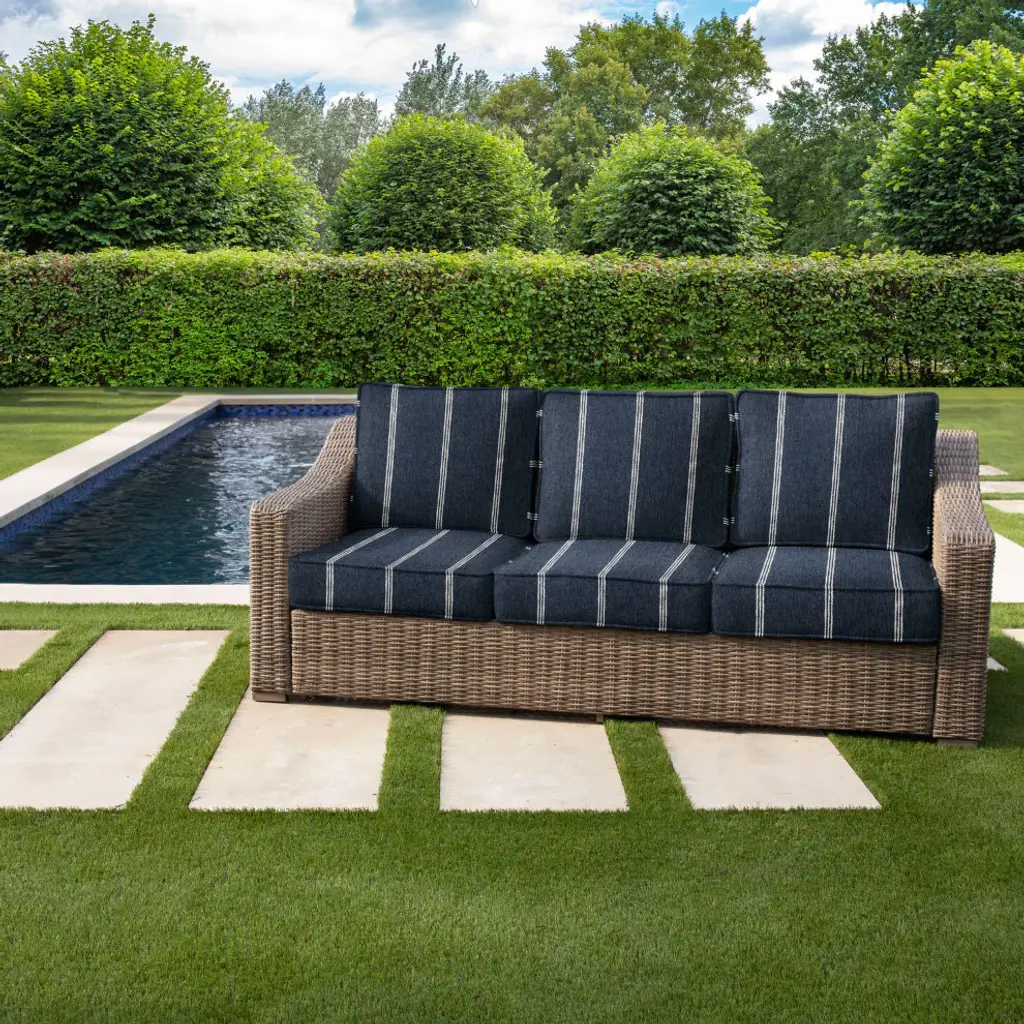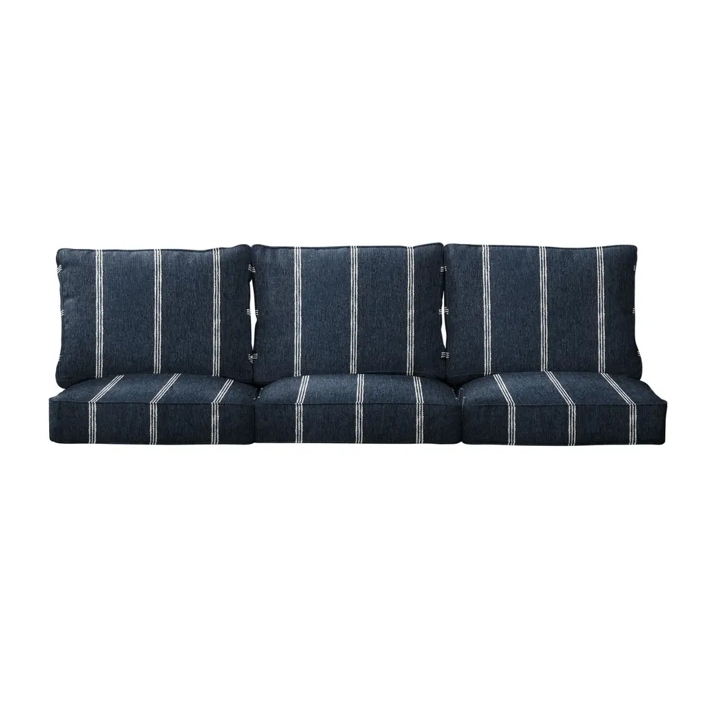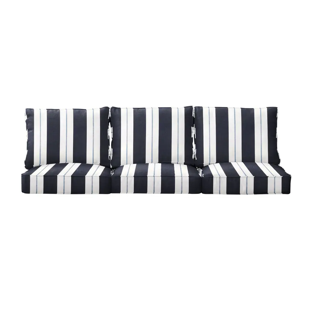 Supreme comfort and a beautiful shade, mark the selling points of this beautiful outdoor sofa cushion set with a unique fabric color. Enjoy the soft, durable feel of remarkable outdoor fabric that stands up to weather and sun to resist fading and mildew. A fill of pure recycled fiber makes each cushion soft and comfortable. Remove the seat cushion covers easily through a zipped enclosure for care and maintenance. This cushion set is suitable for indoor use, so bring it inside to add a beautiful stamp to a casual space. Sunbrella is founded on the belief that fabrics should be both beautiful and functional. We began in the 1960s with the challenge of creating an awning canvas with a substantially longer lifespan than cotton. Sunbrella has become widely adopted for shade structures, marine canvas and upholstery fabric for both outdoor and indoor applications.Our textiles are made with close attention to design detail, and engineered with robust performance characteristics that provide resistance to fading and degradation from sunlight and chemical exposure. The fabric is tactile yet durable, has industry-leading environmental characteristics, is easy to care for and offers long life wherever it''s used.No Sunbrella manufacturing facility in the world sends waste to landfills. A result of our focus on efficiency, this monumental achievement allows Sunbrella to lead by example, putting sustainability into practice every day across the globe. Our unique coloring process not only makes Sunbrella fabrics fade-resistant, it also conserves more water than conventional dyeing processes. At Sunbrella we believe it''s important to preserve the environment around our facilities. We work to conserve the plant and animal life that is native to the area and encourage our employees to plant gardens designed to provide fresh food and nourish local wildlife.We stand behind our fabrics with a guarantee that''s the best in the industry: a 5-year limited warranty for upholstery. This warranty protects the original purchaser of Sunbrella fabric. This warranty protects against Sunbrella fabric becoming unserviceable due to color or strength loss from normal usage and exposure conditions, including sunlight, mildew and atmospheric chemicals.• Ideal for casual indoor and outdoor use• Includes two (3) back cushions and two (3) seat cushions• Cushion covers can be removed for easy cleaning• Available in a variety of colors to ensure that you find the perfect match for your dcor style• Cushions only. Furniture not included.• • Made in North America•