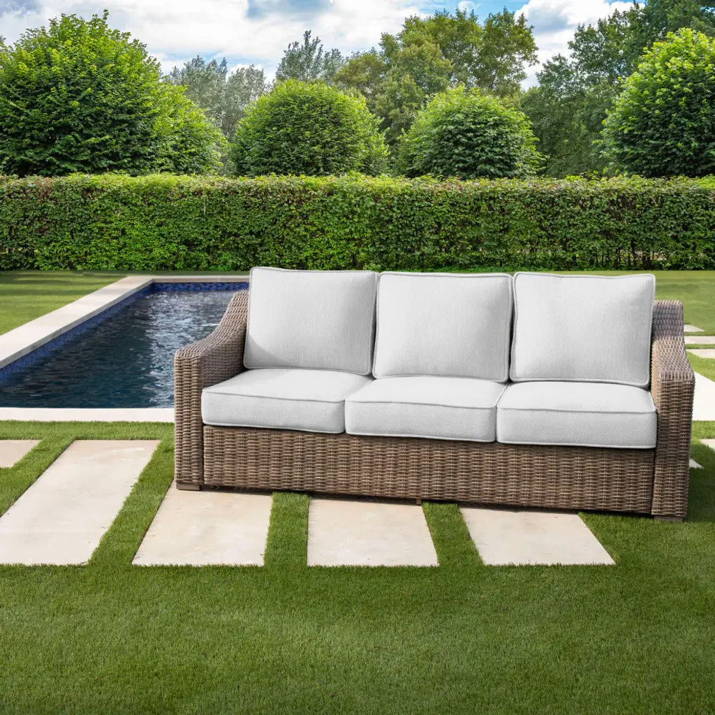 Supreme comfort and a beautiful shade, mark the selling points of this beautiful outdoor sofa cushion set with a unique fabric color. Enjoy the soft, durable feel of remarkable outdoor fabric that stands up to weather and sun to resist fading and mildew. A fill of pure recycled fiber makes each cushion soft and comfortable. Remove the seat cushion covers easily through a zipped enclosure for care and maintenance. This cushion set is suitable for indoor use, so bring it inside to add a beautiful stamp to a casual space. Sunbrella is founded on the belief that fabrics should be both beautiful and functional. We began in the 1960s with the challenge of creating an awning canvas with a substantially longer lifespan than cotton. Sunbrella has become widely adopted for shade structures, marine canvas and upholstery fabric for both outdoor and indoor applications.Our textiles are made with close attention to design detail, and engineered with robust performance characteristics that provide resistance to fading and degradation from sunlight and chemical exposure. The fabric is tactile yet durable, has industry-leading environmental characteristics, is easy to care for and offers long life wherever it''s used.No Sunbrella manufacturing facility in the world sends waste to landfills. A result of our focus on efficiency, this monumental achievement allows Sunbrella to lead by example, putting sustainability into practice every day across the globe. Our unique coloring process not only makes Sunbrella fabrics fade-resistant, it also conserves more water than conventional dyeing processes. At Sunbrella we believe it''s important to preserve the environment around our facilities. We work to conserve the plant and animal life that is native to the area and encourage our employees to plant gardens designed to provide fresh food and nourish local wildlife.We stand behind our fabrics with a guarantee that''s the best in the industry: a 5-year limited warranty for upholstery. This warranty protects the original purchaser of Sunbrella fabric. This warranty protects against Sunbrella fabric becoming unserviceable due to color or strength loss from normal usage and exposure conditions, including sunlight, mildew and atmospheric chemicals.• Ideal for casual indoor and outdoor use• Includes two (3) back cushions and two (3) seat cushions• Cushion covers can be removed for easy cleaning• Available in a variety of colors to ensure that you find the perfect match for your dcor style• Cushions only. Furniture not included.• • Made in North America•
