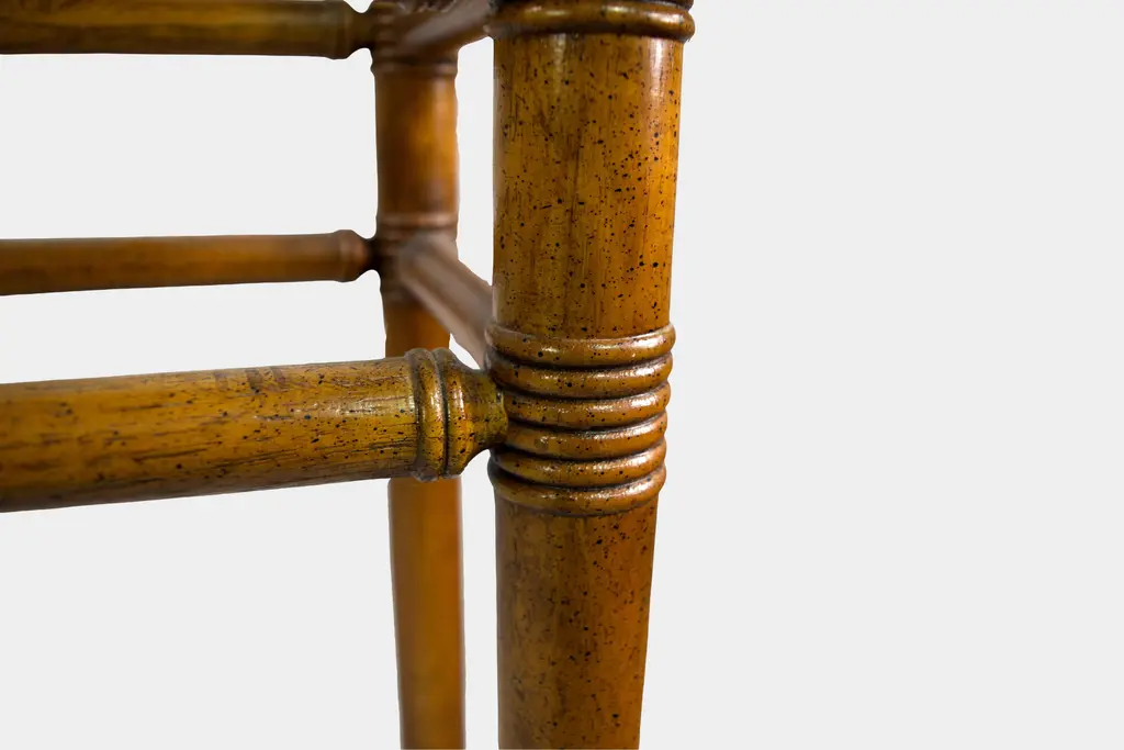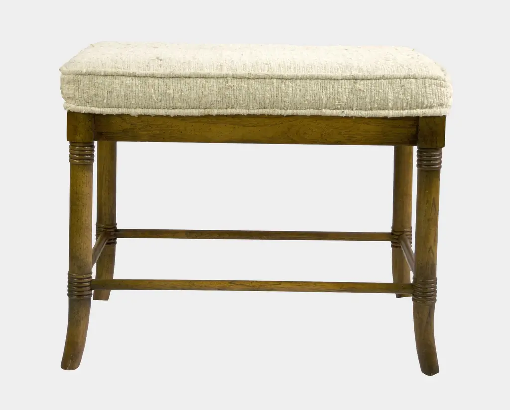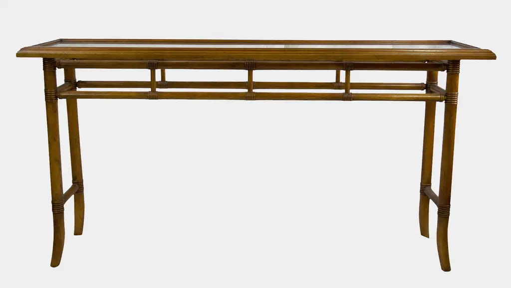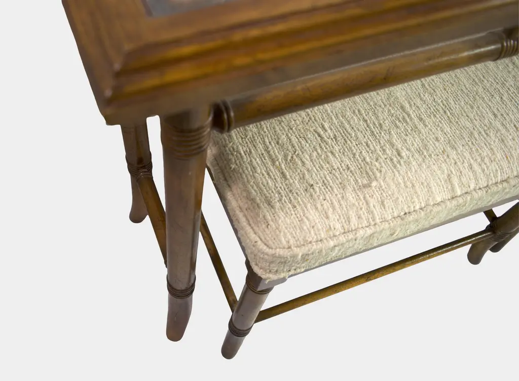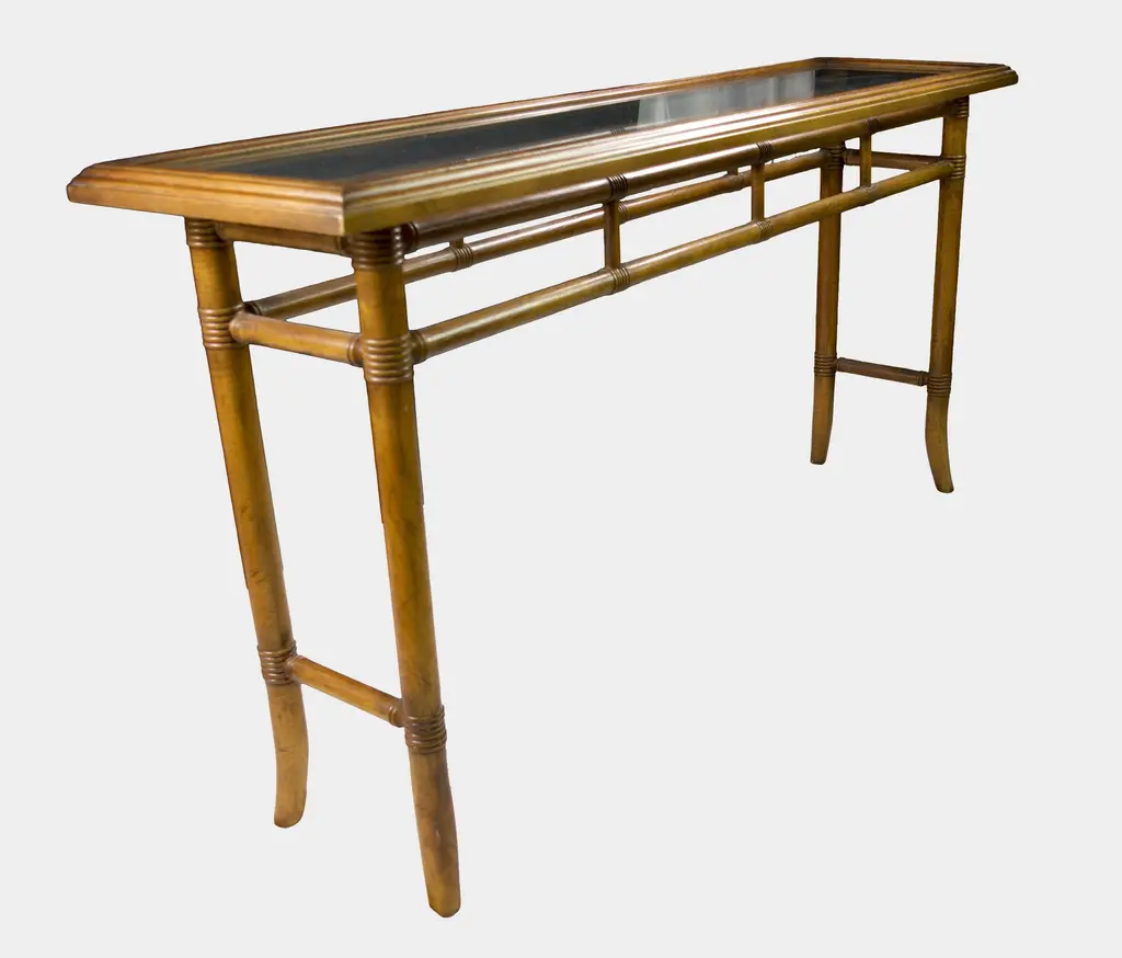 Vintage Drexel Hall/Sofa Table with Faux Bamboo styled walnut and glass top. Two matching ottomans slip underneath for storage and can be pulled out for extra seating. An exquisite design. Ottoman Dimensions in inches: W: 26 H: 18 D: 18 Seat Height: 15"