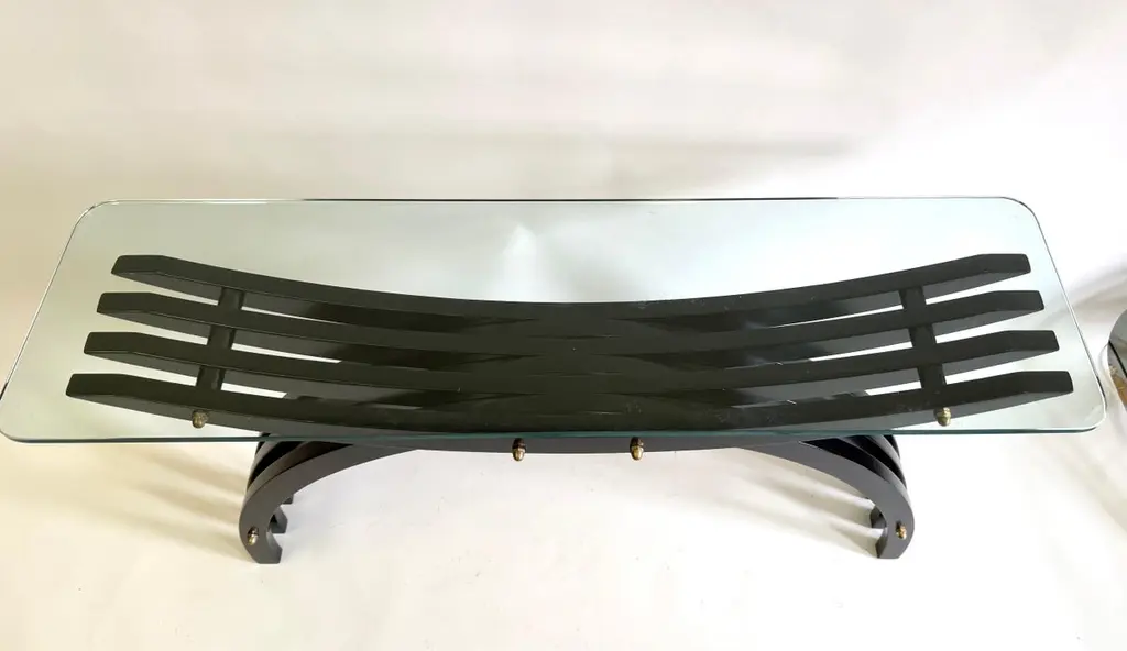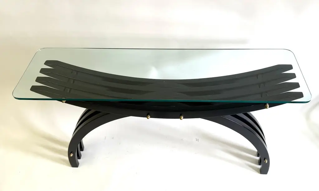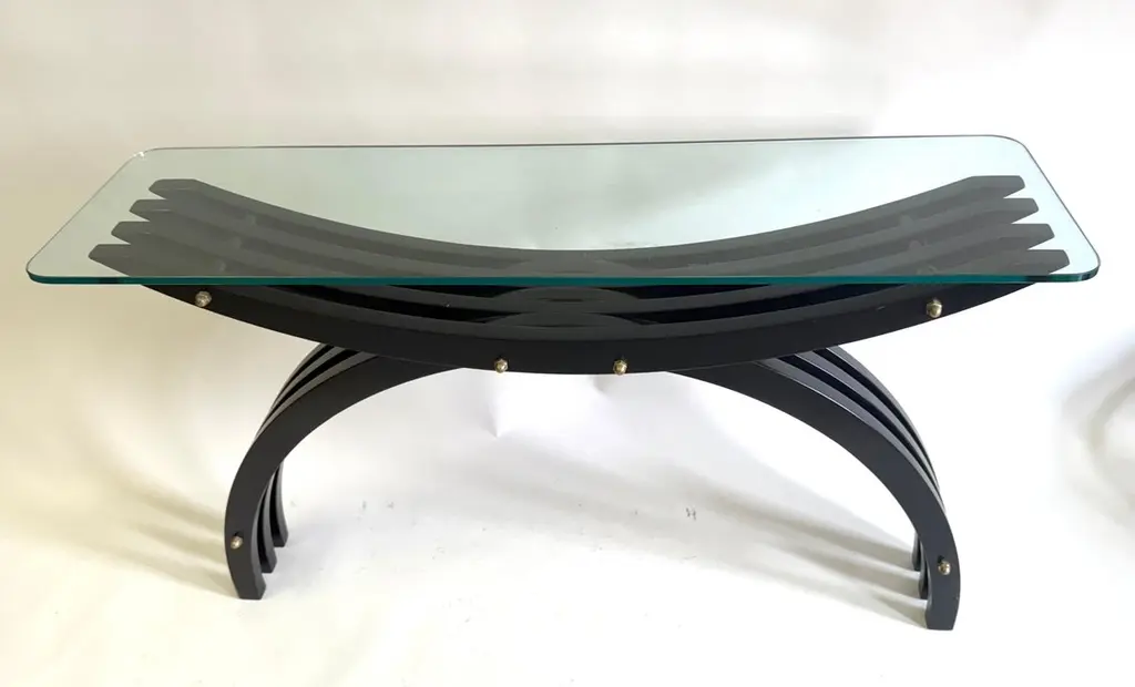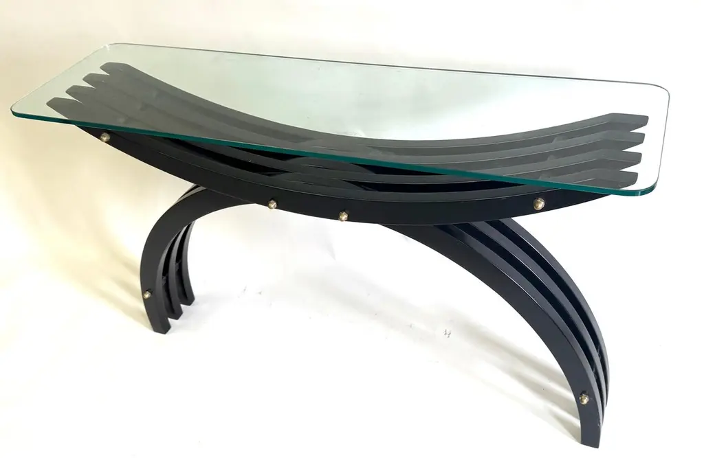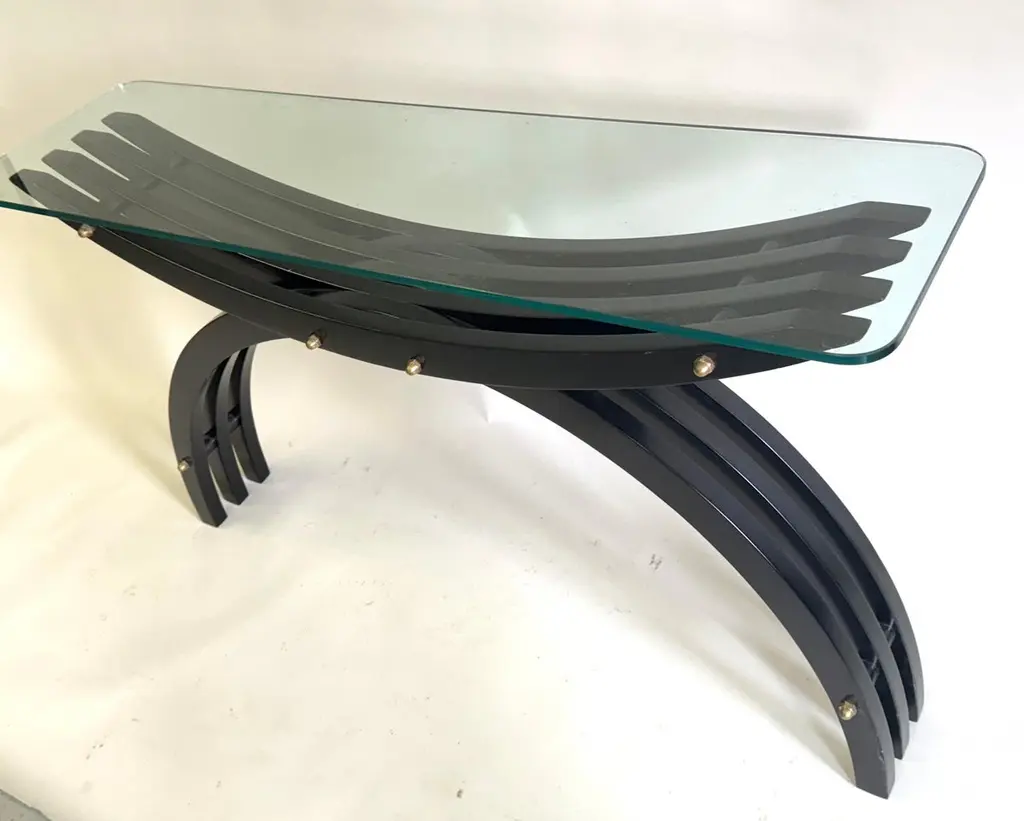 2 Rare and Exemplary Italian Midcentury Modern Consoles or Sofa Tables in the style of Carlo Mollino, circa 1950. (Priced and Sold as Individual Pieces). The consoles are in enameled beech wood and feature rare forms emphasizing curved forms and intersecting angles in a symphony of dynamic movement. The composition utilizes continuous curved forms to create both the legs and top supports and are united by solid brass rods at their inflection points. Glass tops highlight the architecture of the pieces allowing one to enjoy the transparency of the structure. Priced and sold individually. Dimensions: Console without Top: H 29.5 x W 47.25 xD 8.25. Suggested glass top W 51.25 x D 10.25, to 12.25” (The existing glass shown is 51.25,x 14.25”)Additional References: Gio Ponti, Jean Prouve.