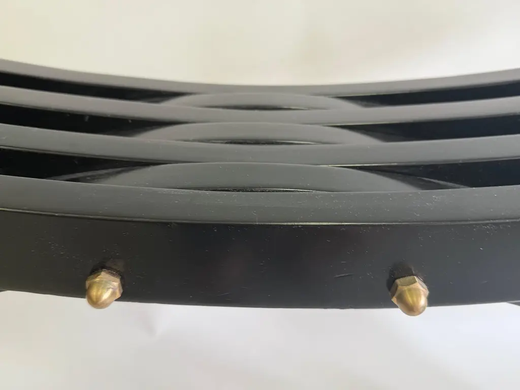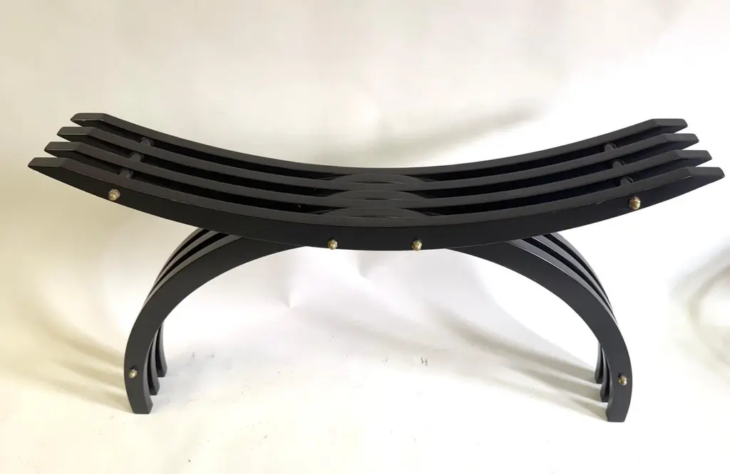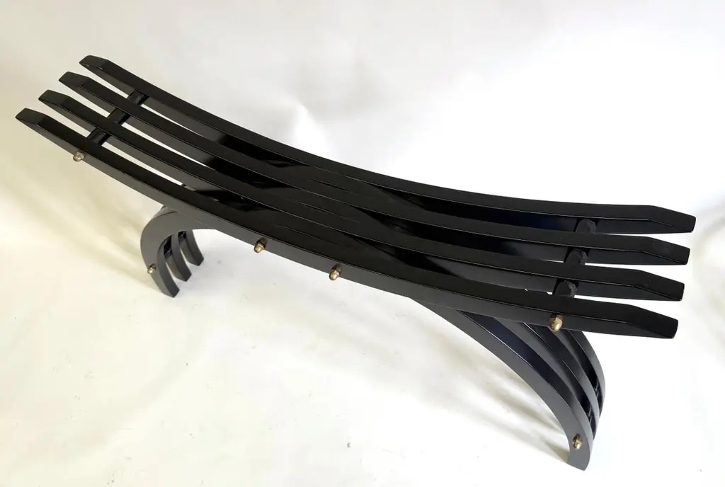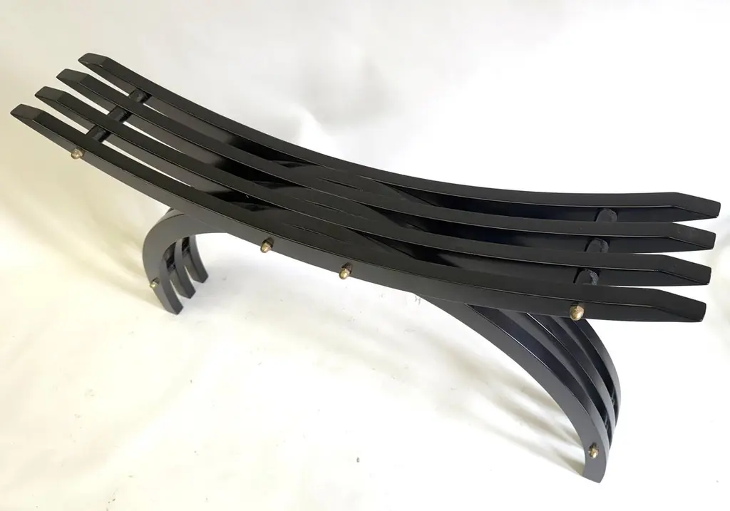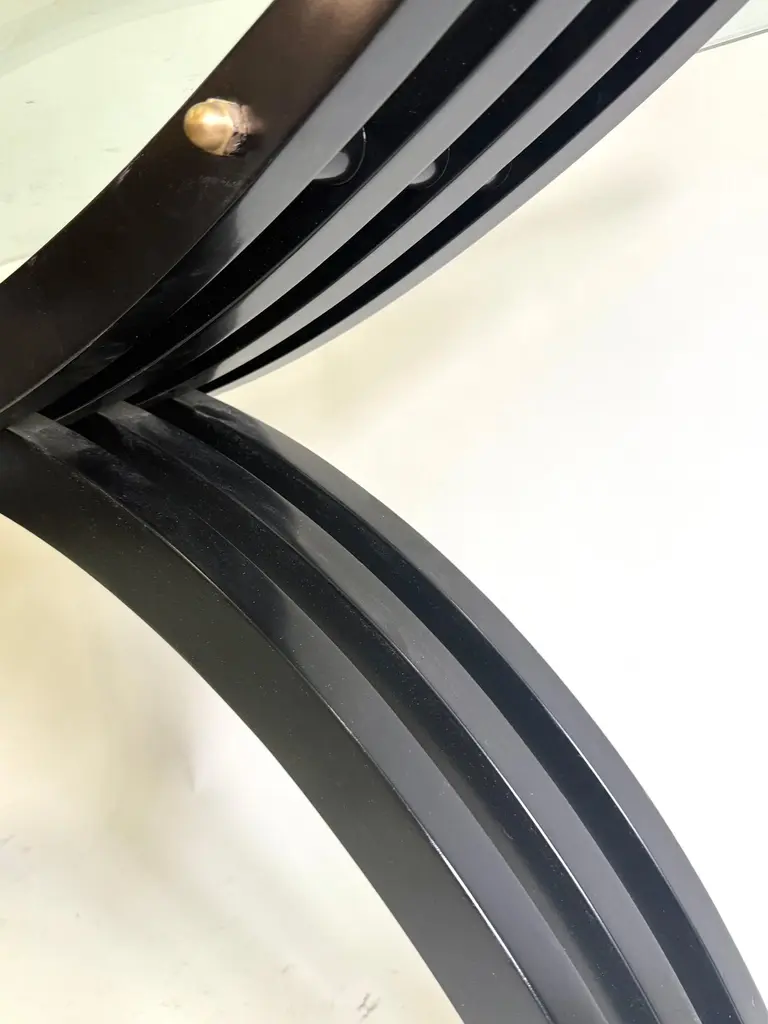2 Rare and Exemplary Italian Midcentury Modern Consoles or Sofa Tables in the style of Carlo Mollino, circa 1950. (Priced and Sold as Individual Pieces). The consoles are in enameled beech wood and feature rare forms emphasizing curved forms and intersecting angles in a symphony of dynamic movement. The composition utilizes continuous curved forms to create both the legs and top supports and are united by solid brass rods at their inflection points. Glass tops highlight the architecture of the pieces allowing one to enjoy the transparency of the structure. Priced and sold individually. Dimensions: Console without Top: H 29.5 x W 47.25 xD 8.25. Suggested glass top W 51.25 x D 10.25, to 12.25” (The existing glass shown is 51.25,x 14.25”)Additional References: Gio Ponti, Jean Prouve.