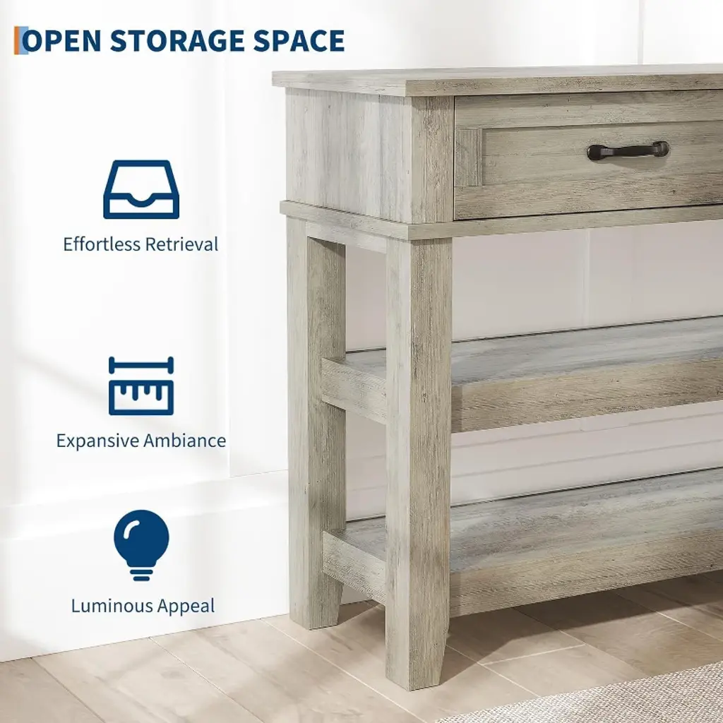 Enhance your living space with this versatile 2 Tier Entryway Console Table, designed to combine functionality and industrial style. Crafted with natural wood and sturdy metal, this sofa table features 2 spacious storage drawers and 3 tiers of shelving, providing ample space to organize your essentials and display your favorite decor. Its sleek industrial metal frame complements the warm wood finish, making it a perfect addition to your living room, corridor, or entryway.