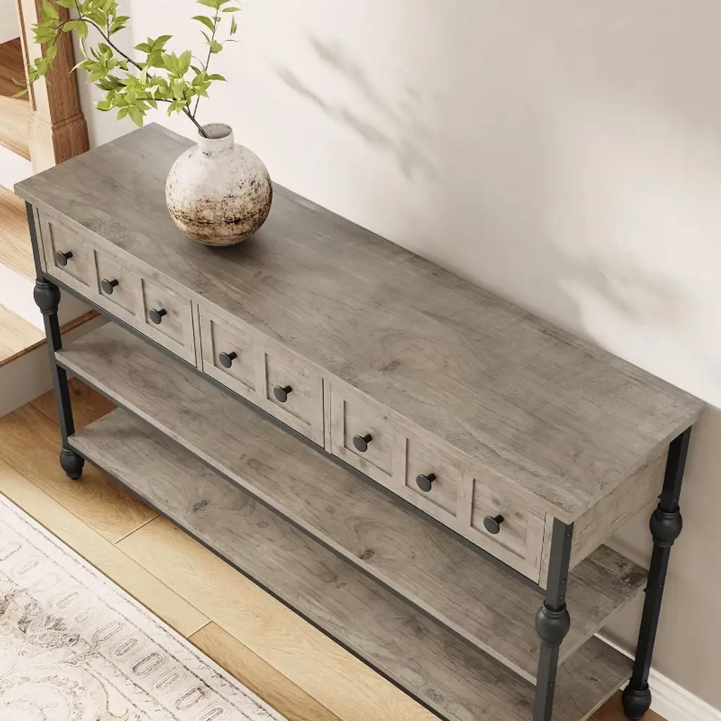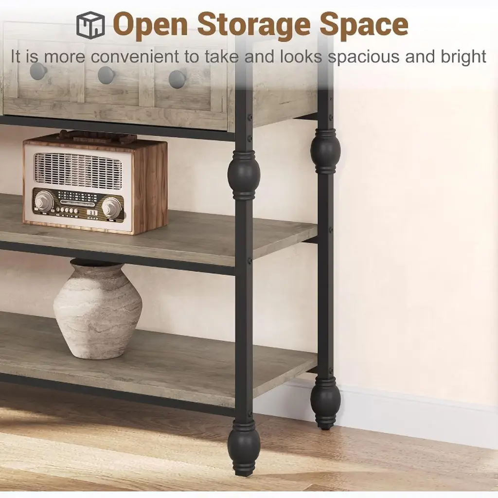 Three Drawers and Open Storage Shelf: This 3 tier console table is designed with three storage drawers, available in two lengths:17.72" and 12.2", providing generous space for your essentials. The lower shelf is perfect for accommodating storage baskets or taller decorative items, with the two shelves positioned at heights of 7.52" and 7.99", thereby enhancing your storage capacity. Multifunctional Design: Minimalist diamond frame design lends industrial flair to this gray sofa table. Versatile appearance makes this console table perfect to be a TV stand, long horizontal bookshelf or rustic entryway table with storage. Durable and Sturdy Materials: Built with an industrial metal frame and high-quality MDF, the metal frames are crafted through a multi-layer process. Our premium MDF is pressed using cutting-edge technology and increased pressure. This console table for the entryway features a tabletop that is both waterproof and resistant to corrosion. Multi-functional Use: This farmhouse console table is ideal as a sofa table, entryway table, or hallway table, effortlessly blending with various home styles.The table surface is waterproof and corrosion-resistant, allowing for easy cleaning with a damp cloth Easy Assembly: Prior to shipping, our product is thoroughly inspected and carefully packaged to ensure an effortless assembly experience. Assembling this three-drawer console table is straightforward, as it comes with detailed installation instructions, numbered parts, labeled accessories, and precisely aligned holes for quick and accurate setup.
