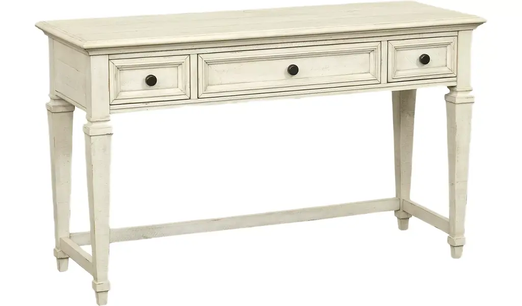 Bring rustic, farmhouse-inspired style into your home with the addition of our Beckley sofa table. This piece boasts a hand-painted white finish, pine solids, oil-rubbed bronze knobs and the charming durability of pine solids and smooth-finished drawers with English dovetailing.