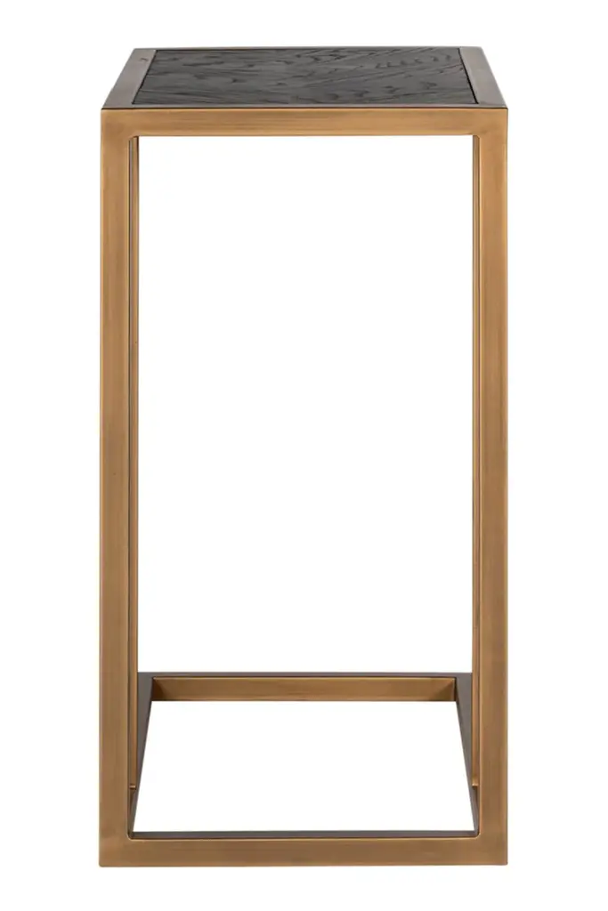 The Blackbone sofa table by Richmond Interiors carries a sense of grace that will never go out of style. Its black oak tabletop in herringbone pattern sits atop an L-shaped brass base. Its subtle elegance will upgrade any interior scheme.ak veneertainless Steel