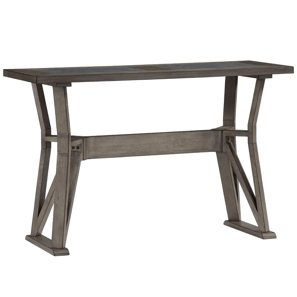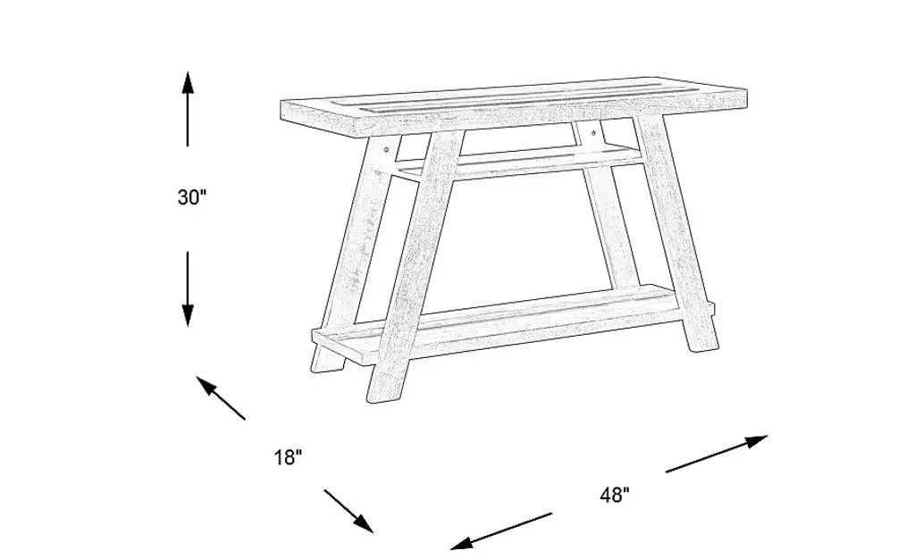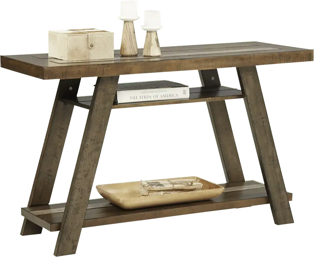 Gain surface space with warm rusting styling when you add the Cedar Creek sofa table to your living space. The table, with a plank style top and two lower display shelves, is made with poplar solids and birch veneers in a rich brown finish. Angled legs reinforce the sense of cozy, casual styling.