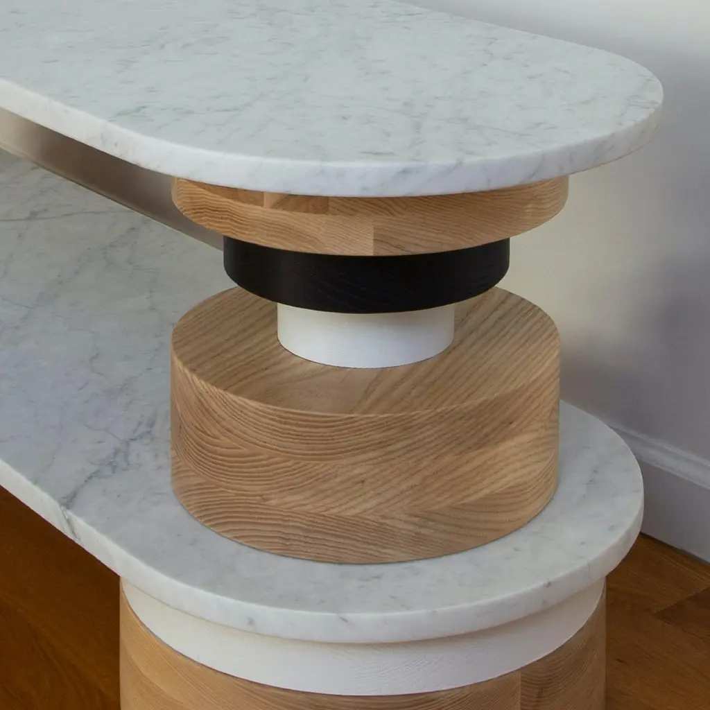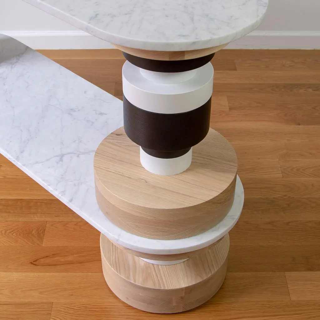 The Sottsass-inspired “Sass Sofa Table” is a bold, graphic statement piece. A honed Carrara marble top sits on an Amish-made base composed of painted and stacked wood circles. Made to order.The version as shown in the first image is 18" tall, 16" deep and 54" long. We can also customize the piece in a myriad of ways (wood species, wood color, surface material, size, etc).