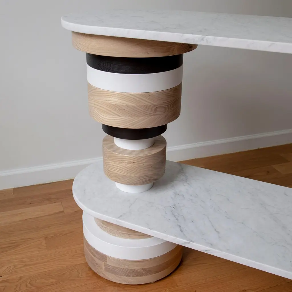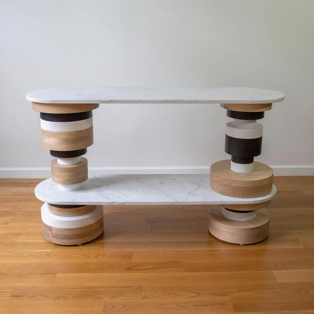 The Sottsass-inspired “Sass Console Table” is a bold, graphic statement piece. A honed Carrara marble top sits on an Amish-made base composed of painted and stacked wood circles. Made to order.The version as shown is 32.5" tall, 16" deep, and 54" long. We can also customize the piece in a myriad of ways (wood species, wood color, surface material, size, etc).