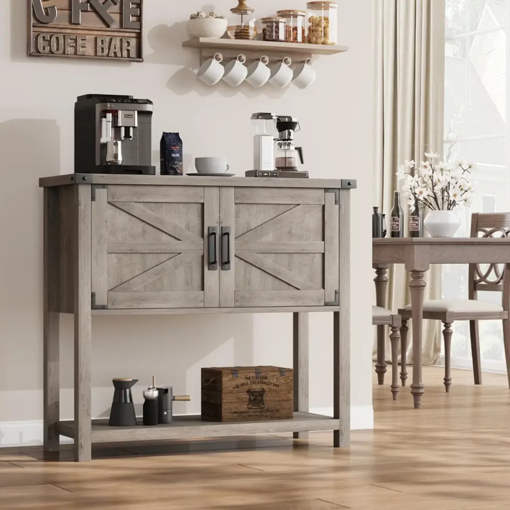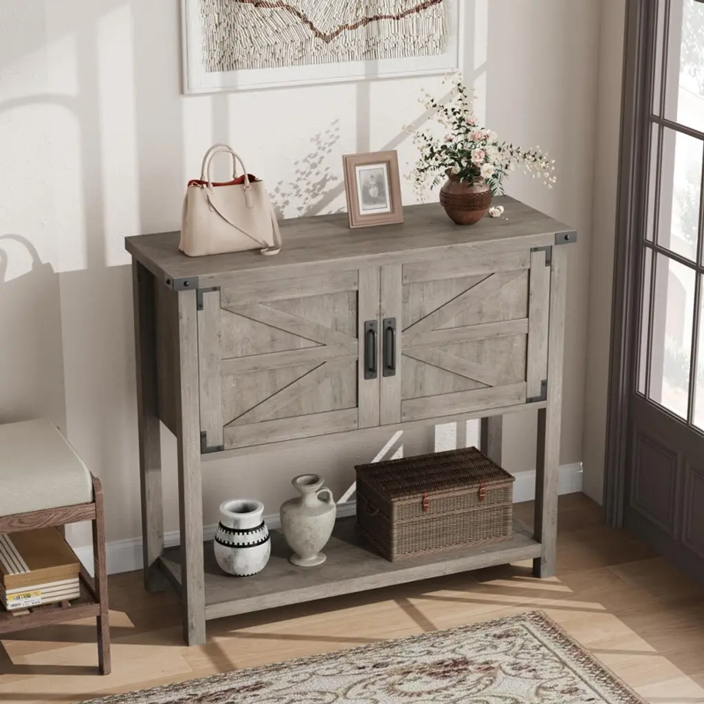Farmhouse Entryway Table with Storage ¨C 36" 2-Door Console Table, Coffee Bar Cabinet & Multifunctional SideboardProduct Highlights? Rustic Charm Meets Functionality Farmhouse-style design with black & white two-tone finish Clean lines complement modern, rustic, or traditional decor Versatile placement ¨C perfect for entryways, kitchens, or living rooms ? Smart Storage Solutions 2 cabinets + 2 drawers for hidden and display storage Spacious tabletop (31.5" x 14.2") for decor or serving Open & closed storage keeps essentials organized yet accessible ? Built to Last Engineered wood construction ¨C scratch & water-resistant 4 non-slip legs for stability on any flooring Durable finish withstands daily use Technical SpecificationsFeatureDetailsDimensions36" W x 16.1" D x 7.5" HTabletop Size31.5" x 14.2"MaterialEngineered woodStorage2 doors + 2 drawersAssemblyRequired (tools + instructions included)Special FeaturesUnbreakable, multifunctionalWhy Choose This Entryway Table?? Space-Saving ¨C Slim 16.1" depth fits narrow areas? Multi-Room Use ¨C Works as coffee bar, sofa table, or sideboard? Easy to Clean ¨C Wipeable surfaces resist stains? Quick Assembly ¨C No professional skills needed