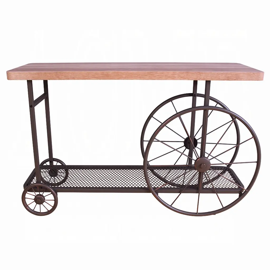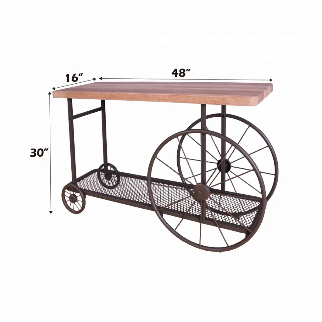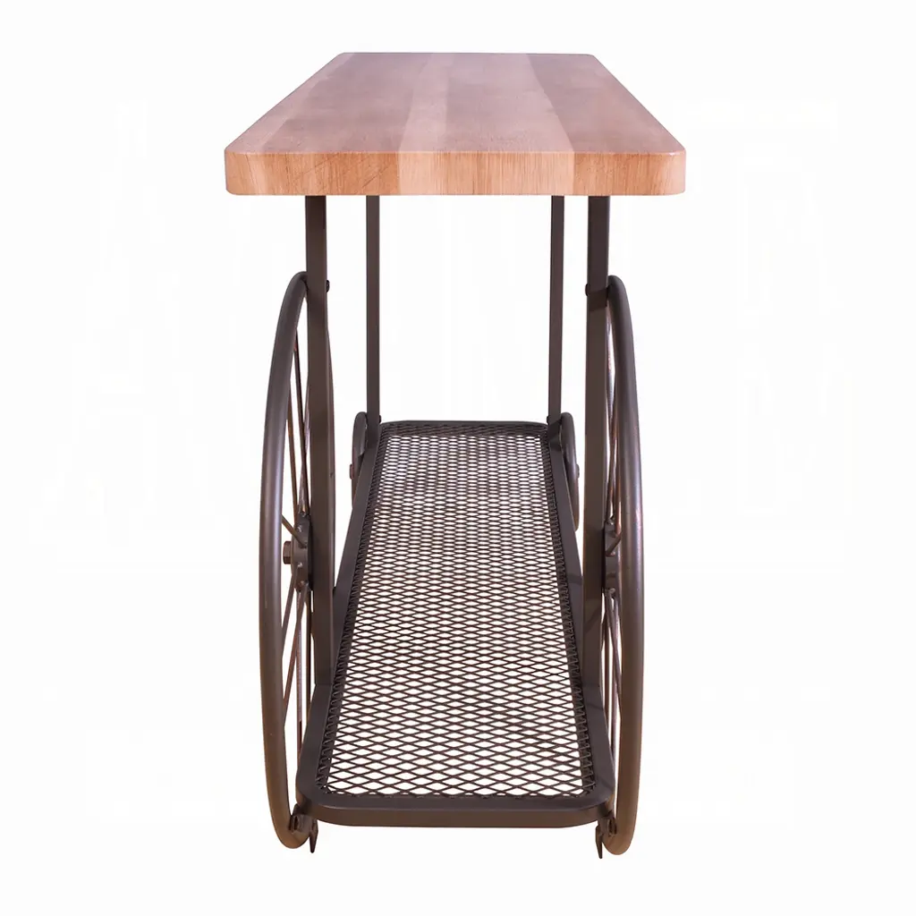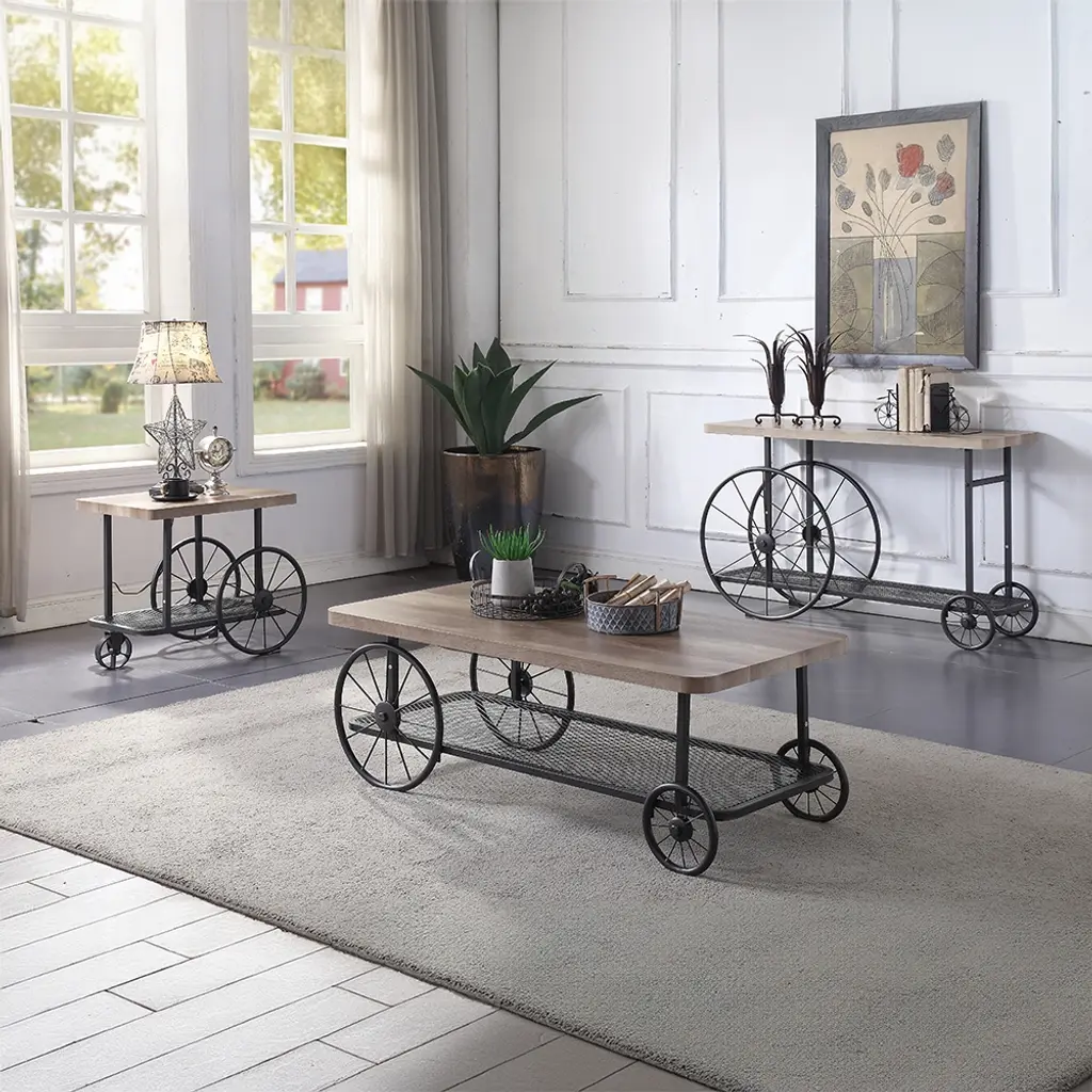 Get on board with the industrial style movement with the Francie occasional tables, it confirms you are hip by having this fun table in your living room. This table features a butcher block top and metal mesh lower shelf supported by wheels in the form of a cart.