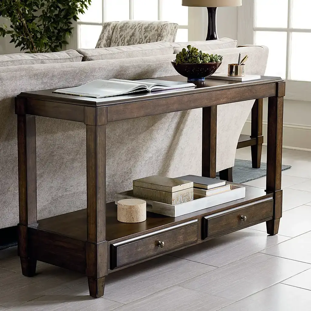 The Halsey Sofa Table presents a harmonious blend of functionality and elegance, offering organized storage with its two drawers and convenient lower shelf. Crafted with precision from Walnut Veneers and Select Hardwoods, this piece exudes sophistication while seamlessly complementing a variety of interior aesthetics.