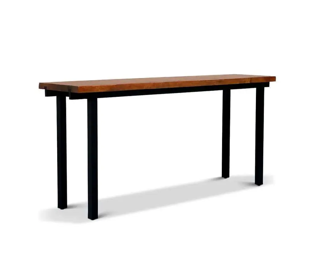 Add the versatile Karsten Sofa Table to your living room and create space seemingly out of nothing. Use it for extra seating by positioning it behind your sofa and adding up to three counter stools. Paired with counter stools and pushed up against a wall makes it ideal for small space dining. Or take the eclectic route and use it as a high end table for decor or house plants. And it's not just about utility: blackened metal and richly-hued solid poplar with a live-edge design complement one another beautifully, giving you that rustic-industrial accent you've been craving. To enhance the rustic look of the wood, the surface of this piece is both intentionally distressed and cut with a smoothed live edge, making each piece one-of-a-kind.