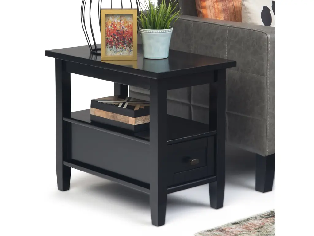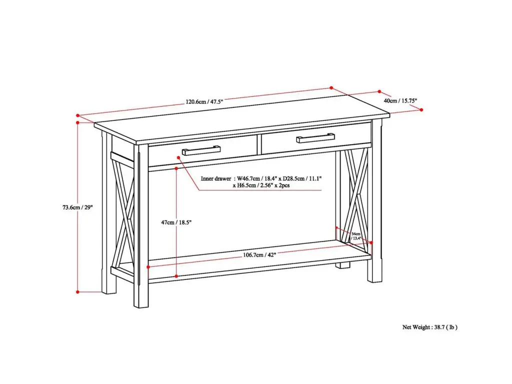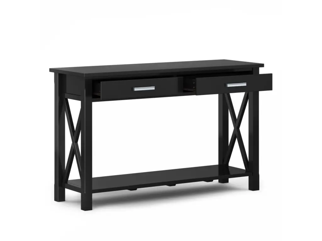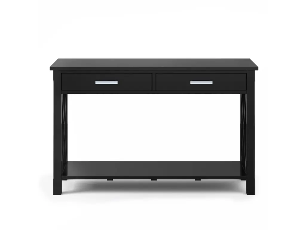 Handcrafted with care using high quality solid pine, this sofa table includes a storage shelf and a large drawer with brushed nickel-tone drawer pulls. Featuring X-shaped legs, smooth squared edges for modern charm and finished with a black stain and protective NC lacquer to highlight the grain, this table exudes rustic charm.
