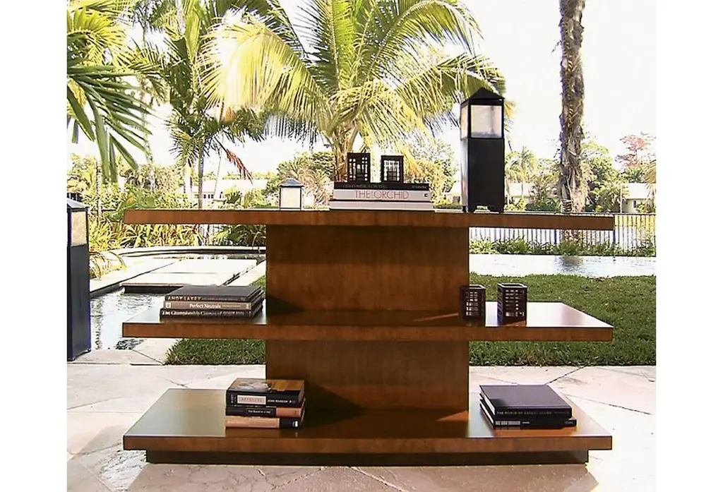 This beautifully balanced piece features two floating shelves that extend from a strong center column. Ideal for modern or contemporary spaces, this sofa table makes a great display piece for collections or books.