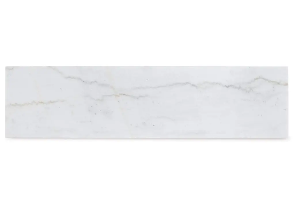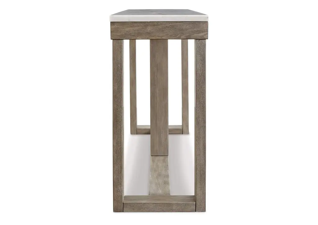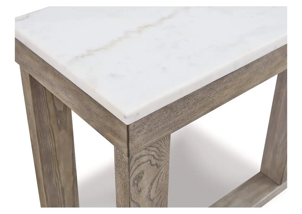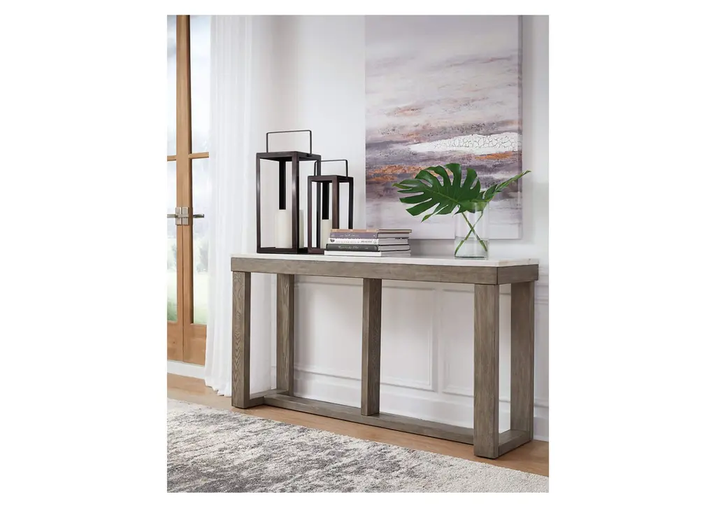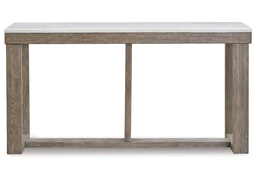 The Loyaska sofa table is simple in design but big on style. Finished with a trend-right grayish brown wood tone, its bold, blocky profile and natural marble top are timeless classic choices that is ideal for pairing with an ottoman underneath to pull extra seating into the room or remaining clean and sleek on its own. Adding to its beauty, the marble top's color variations, fissures, mineral deposits and veining are naturally formed and are not defects. Weight 112.000 lbs. (50.4kgs.)