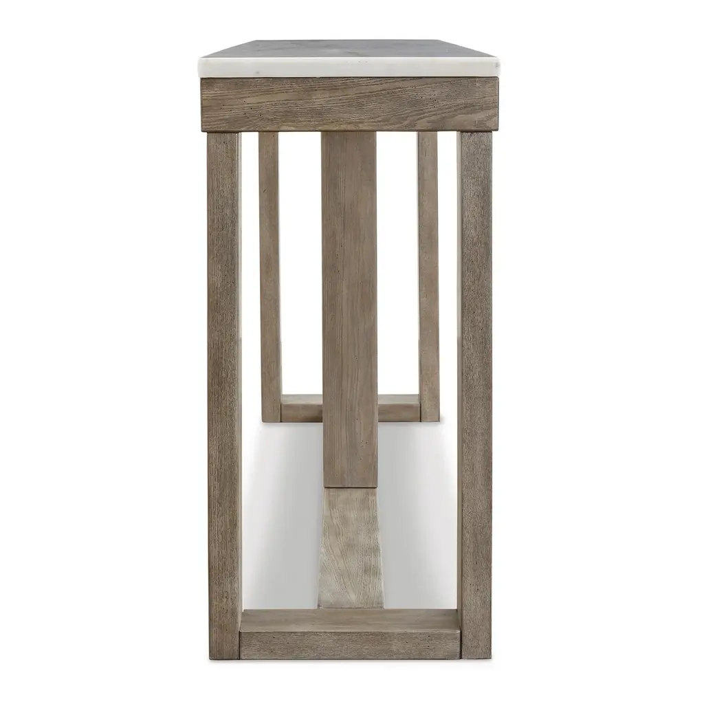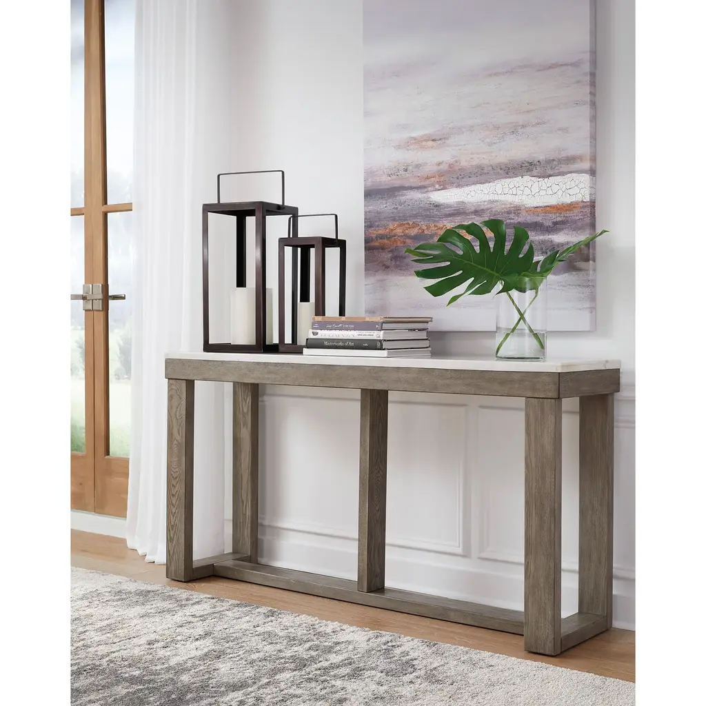 This sofa table is simple in design but big on style. Finished with a trend-right grayish brown wood tone, its bold, blocky profile and natural marble top are timeless classic choices that is ideal for pairing with an ottoman underneath to pull extra seating into the room or remaining clean and sleek on its own. Adding to its beauty, the marble top's color variations, fissures, mineral deposits and veining are naturally formed and are not defects. - Product Details provided by Manufacturer, Slumberland not responsible for errors in information.
