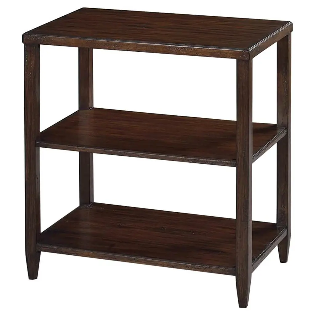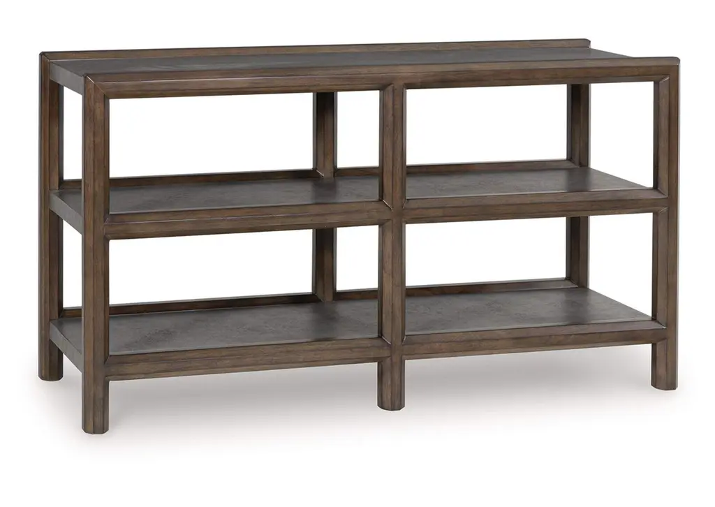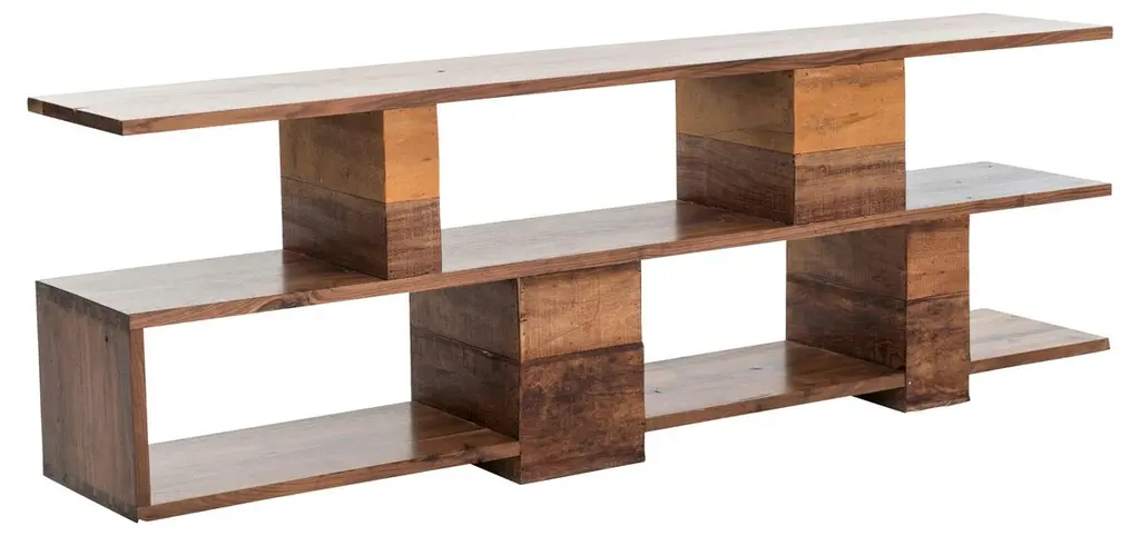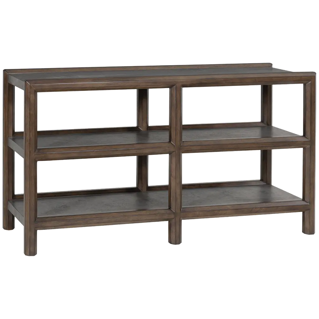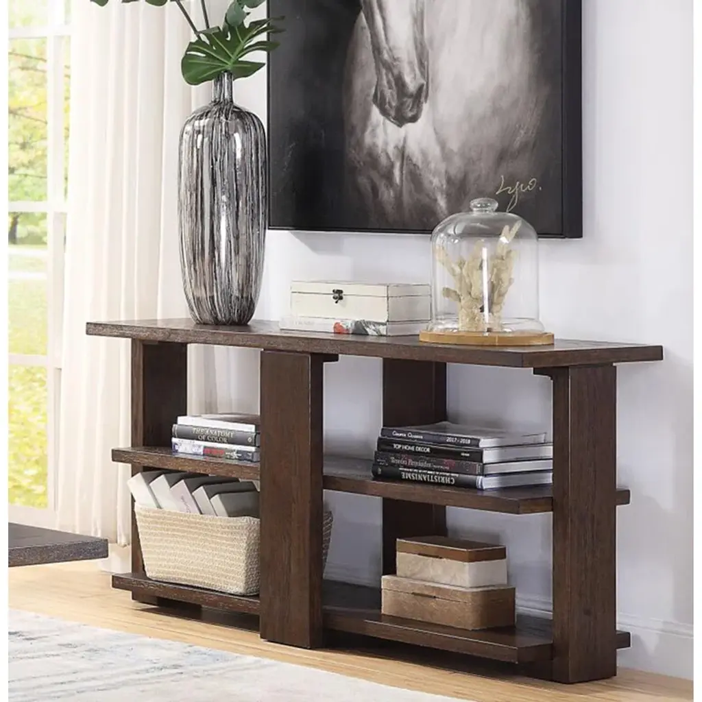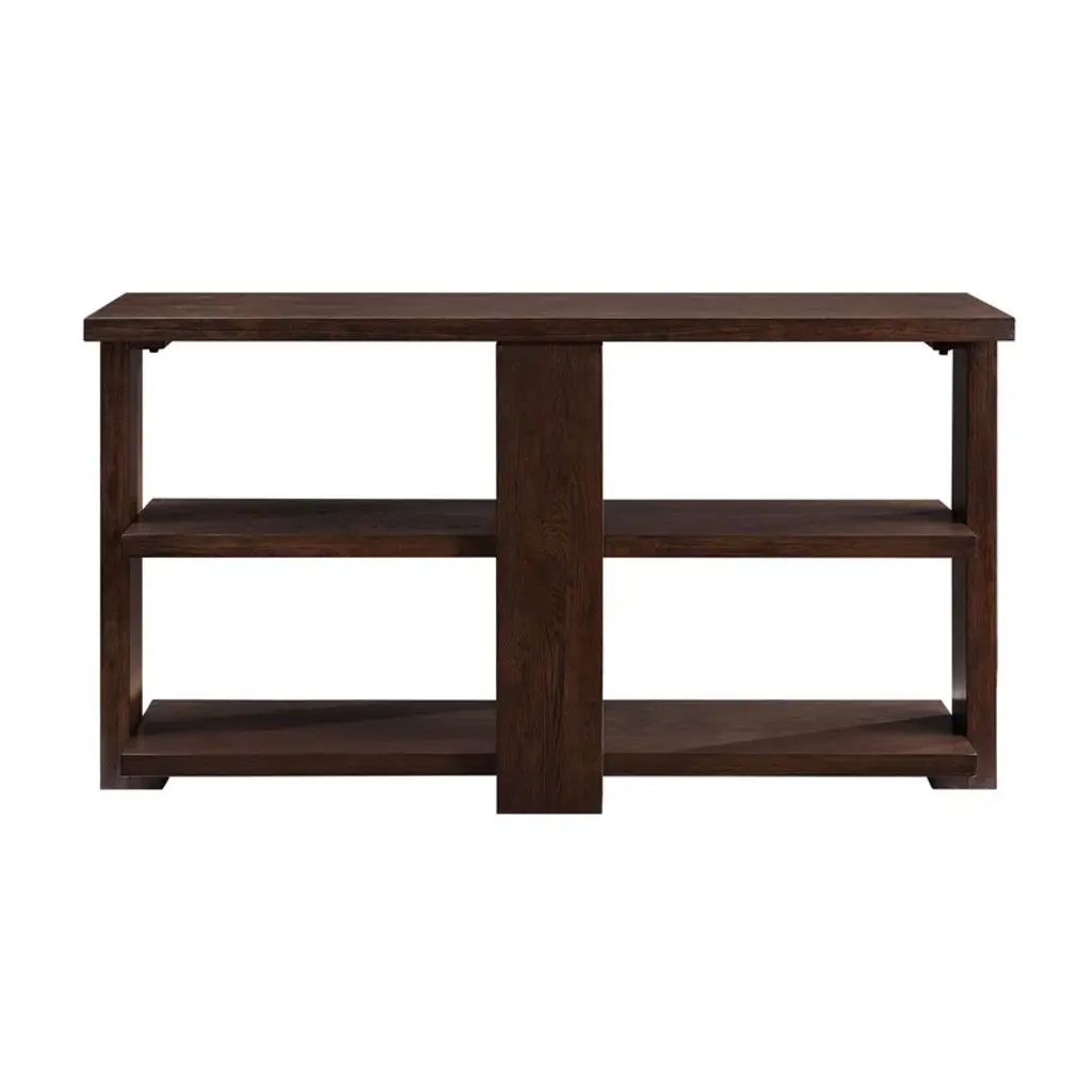 Centered supports on a transitional wooden console table turn convention on its head and bring engaging character in a living room or entry. A rich walnut wood finish is classic and neutral as the table offers ample space for display with two open shelves underneath a smooth tabletop.