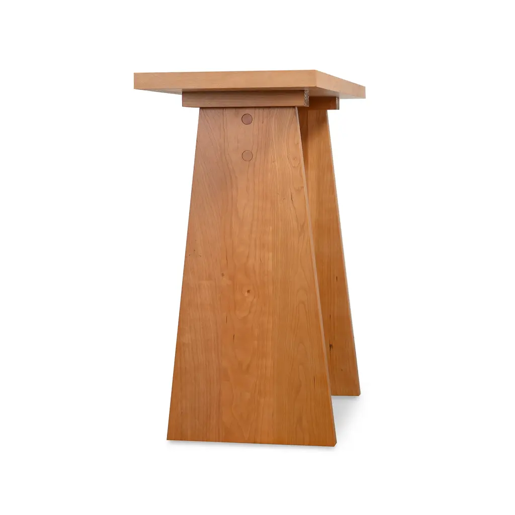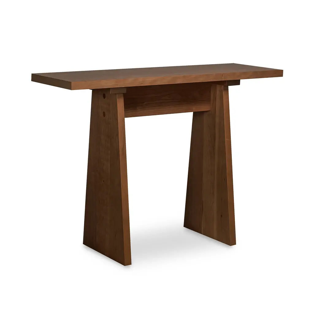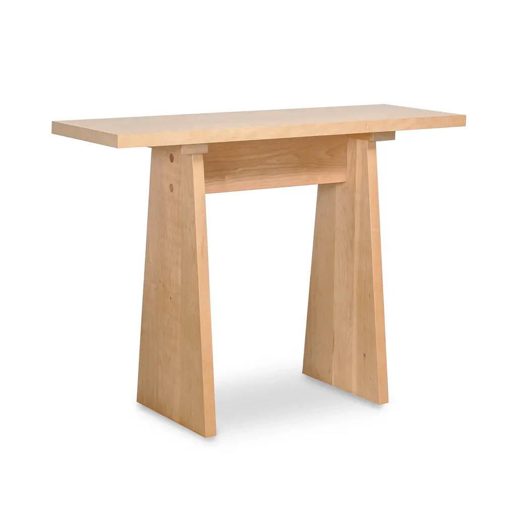 Our Modern Designer Sofa Table is handcrafted in Vermont using sustainably harvested solid woods. Each table is custom made by skilled craftspeople. Natural finish protects and enhances the beauty and grain of the wood. The result is a beautiful, solid wood table perfect for a loft or city apartment. A modern, clean and simple design that looks great in any setting.Base price represents 14" x 42" x 30" sofa table in natural cherryShown in 14" x 42" x 30" sofa table in natural cherryAssembly required: attach legs with provided hardware