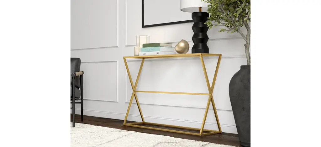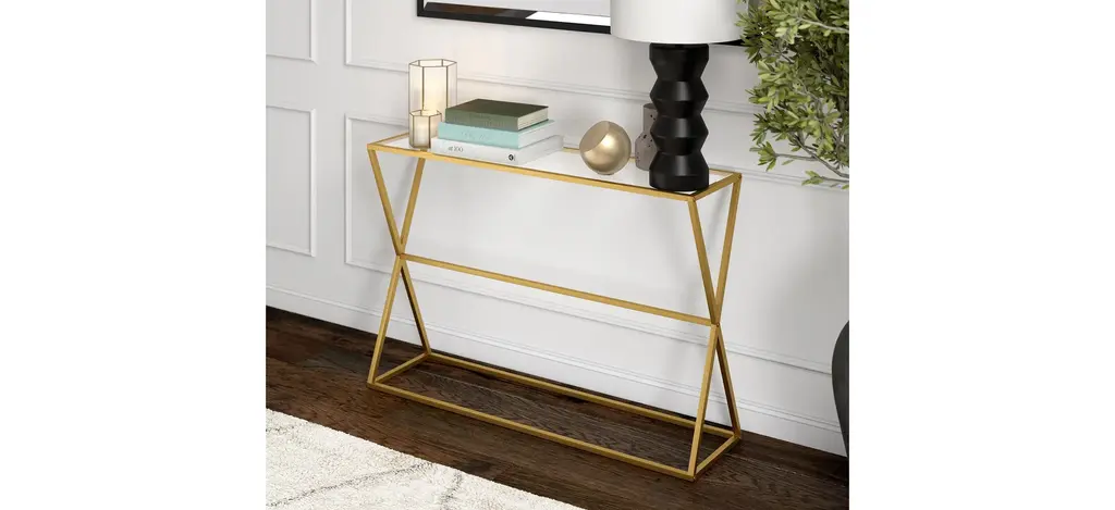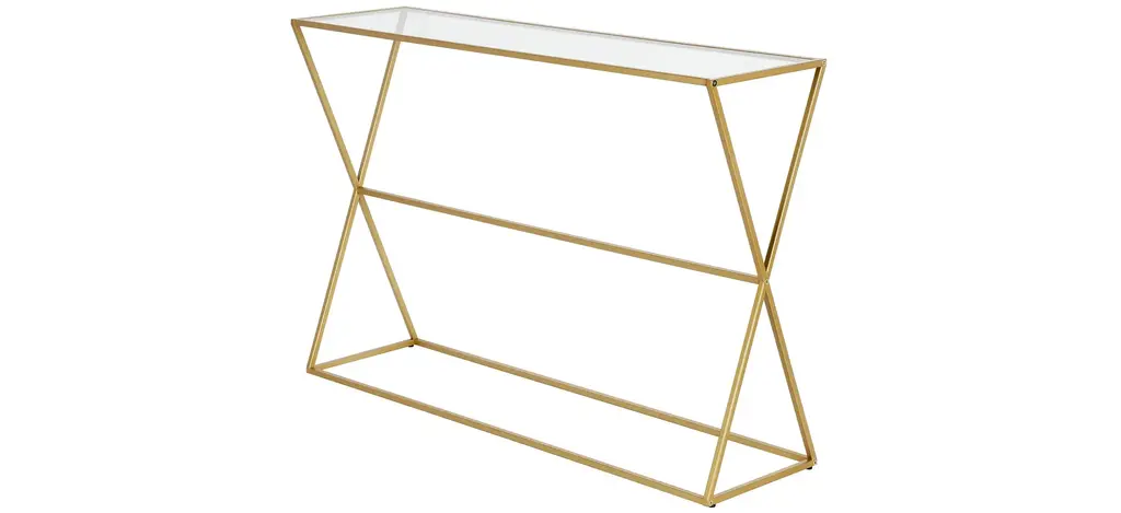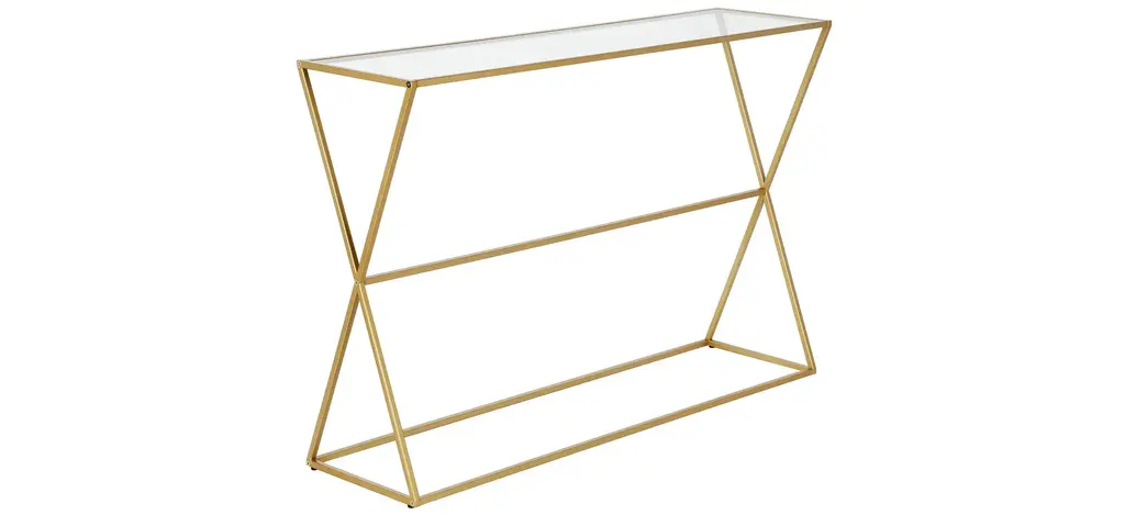 Minimalist geometric lines and a sturdy tempered glass top make this contemporary Paiget sofa table the perfect addition to you living room, bedroom, or entryway. Proudly display knick-knacks, magazines and more on the tempered glass top, or showcase a collection of scarves or textiles on the central crossbar. The streamlined look and neutral metallic finish pairs seamlessly with your existing color scheme and decor style.