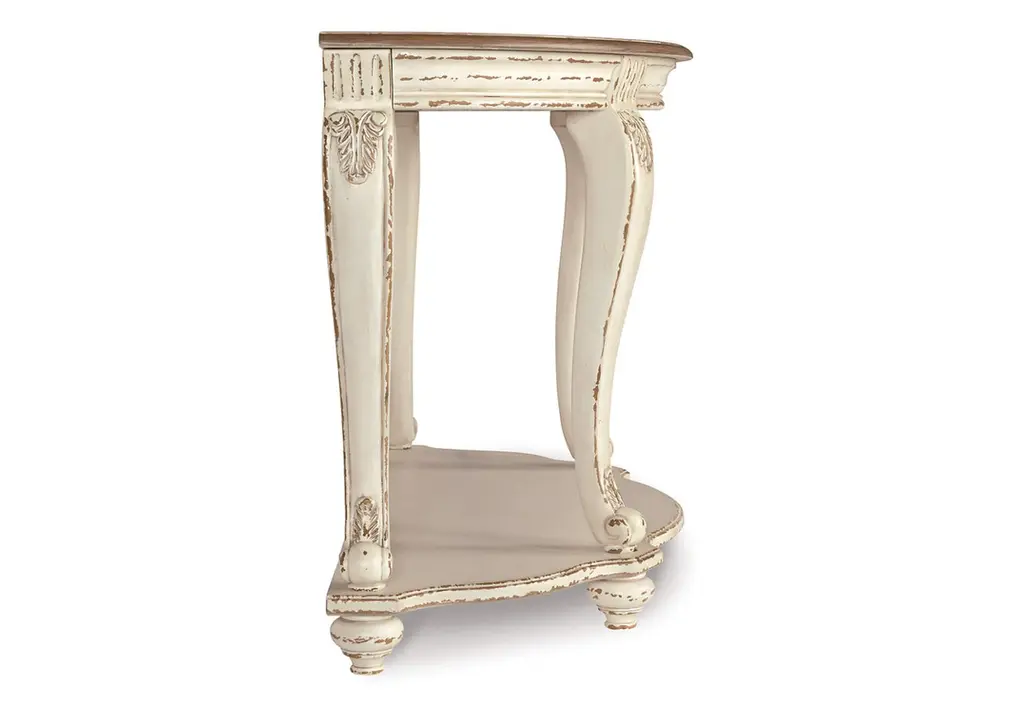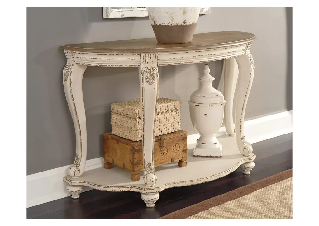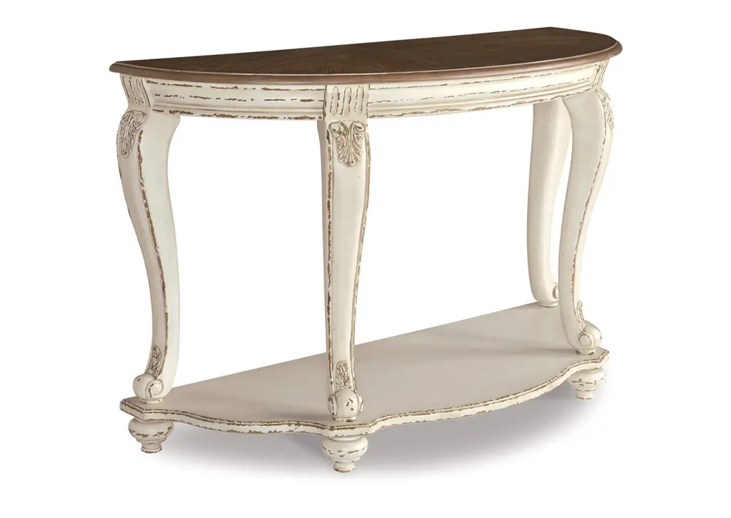 Elevating the art of traditional cottage styling, the Realyn demilune sofa table is sure to serve you beautifully for years to come. Antiqued two-tone aesthetic blends a chipped white with a distressed wood finished top for added charm. Classic cabriole legs and shapely lower shelf are a lovely twist. Decorative corbels add refinement. Weight 50.000 lbs. (22.5kgs.)