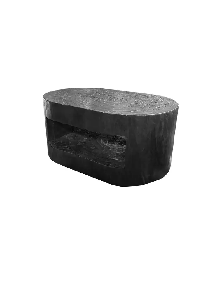 This striking round sofa table is crafted from mango wood, showcasing the natural beauty of the wood's grain while featuring a unique burnt black finish that adds an air of sophistication and rustic charm. A standout design element is the hole at the center of the table, which creates an intriguing focal point and adds a modern, industrial edge to the piece. The table's clean, circular silhouette complements a variety of interior styles, from contemporary to eclectic, making it a versatile and stylish addition to any living room or hallway. Its sturdy construction and distinct aesthetic ensure it will be both a functional surface and a conversation starter in your home.Due to the nature of the raw materials used to create this product each final product will be unique and vary in terms of wood textures and form.