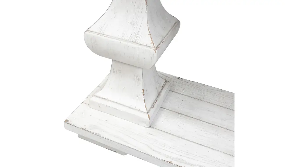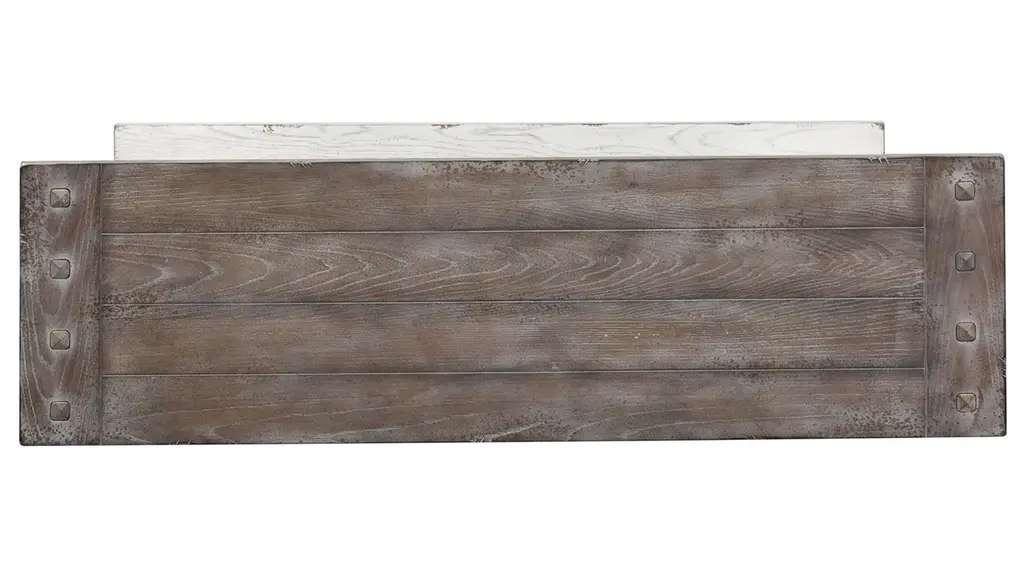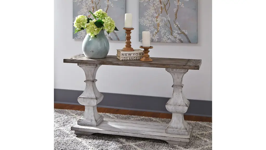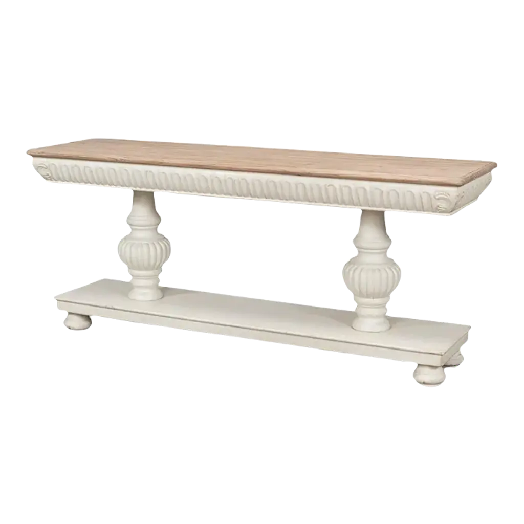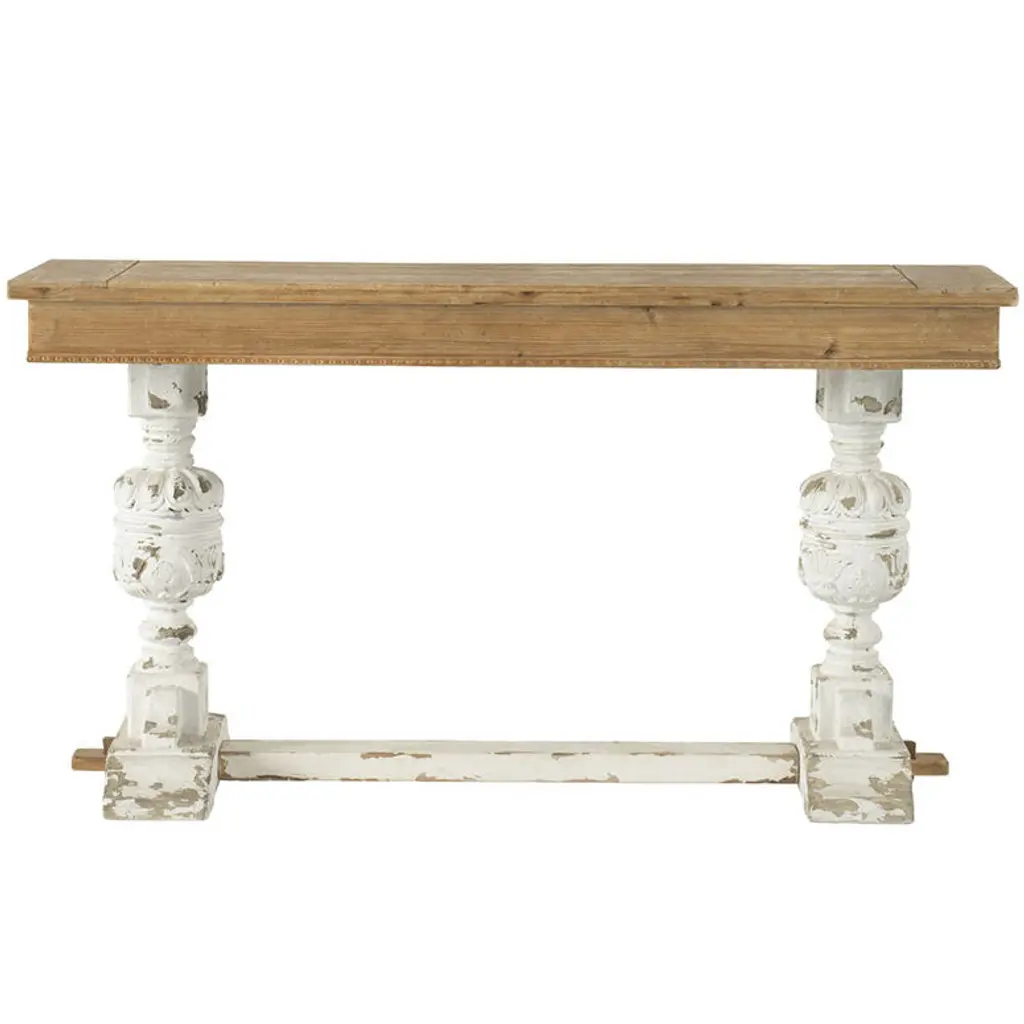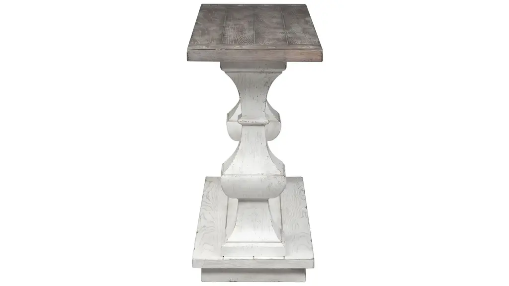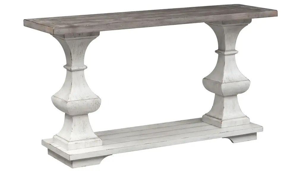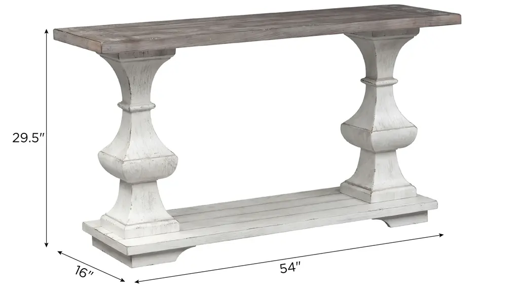 The Sedona sofa table features Spanish style turned legs with a heavy planked top and square peg accents. Bottom shelves for storage and display are featured on the table. This piece is perfect for leather upholstery.