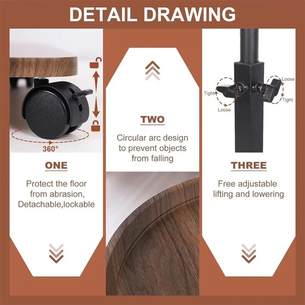 This wheeled side table features an adjustable height design, making it suitable for bathtubs. The 360-degree swivel tabletop allows for easy access while the C-shaped design slides smoothly under your sofa.Crafted with a robust steel frame and thick wood panels, this side table ensures stability. Use it as a workspace for your laptop or as a snack and beverage tray, optimizing your space with both top and bottom surfaces.