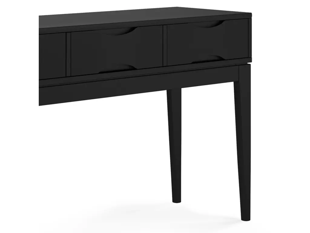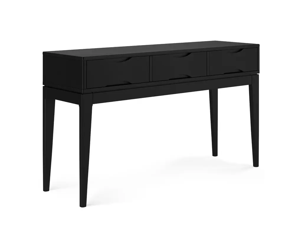 The Harper Console Table is inspired by mid-century silhouettes. The console table is crafted of solid hardwood. Complete with three drawers with notched handles this stylish piece offers plenty of storage space. The Harper Console Table offers versatility allowing you to use it in the living room, the dining room, or entryway.