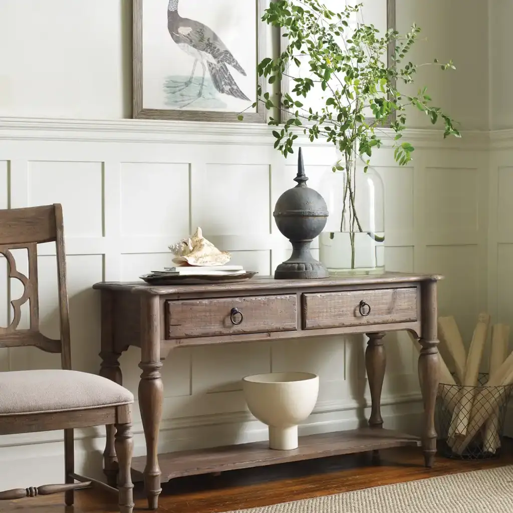 Elevate your living space with the elegant Sofa Table from the Weatherford Cornsilk Collection. This versatile piece combines style and functionality, featuring two convenient drawers for tucking away essentials and a spacious lower shelf perfect for displaying books, decor, or storage baskets. Crafted from genuine New Zealand Pine solid wood, the table boasts exceptional durability and a timeless appeal. Its soft cornsilk finish adds a touch of warmth to any room, complementing various decor styles. Whether placed behind a sofa, in an entryway, or against a wall, this table adapts effortlessly to your needs. With its blend of practical storage and refined design, the Sofa Table is an indispensable addition to your home, offering both beauty and utility in one stunning package.