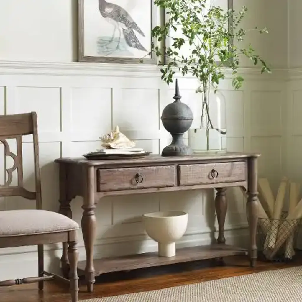 Elevate your living space with the elegant Sofa Table from the Weatherford Heather Collection. This versatile piece combines style and functionality, featuring two convenient drawers for tucking away essentials and a spacious lower shelf perfect for displaying books, decor, or storage baskets. Crafted from genuine New Zealand Pine solid wood, the table boasts exceptional durability and a timeless appeal. Its soft Heather finish adds a touch of warmth to any room, complementing various decor styles. Whether placed behind a sofa, in an entryway, or against a wall, this table adapts effortlessly to your needs. With its blend of practical storage and refined design, the Sofa Table is an indispensable addition to your home, offering both beauty and utility in one stunning package.