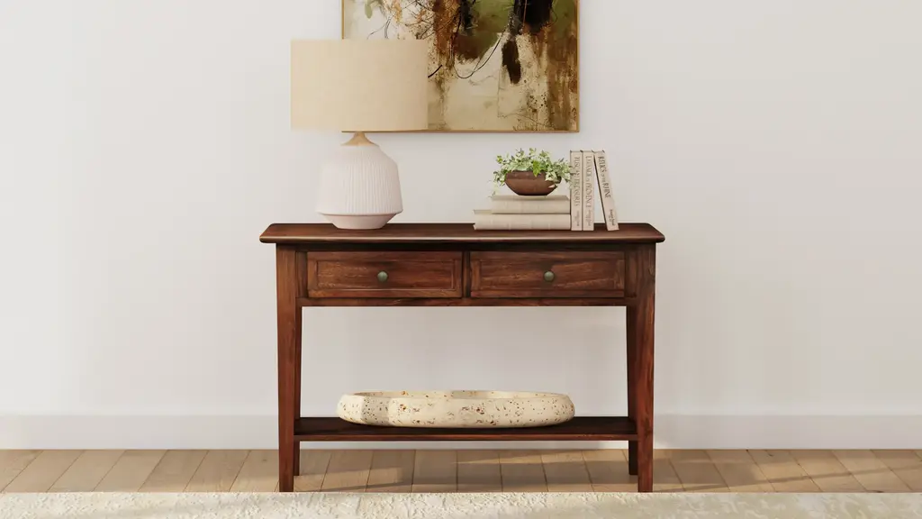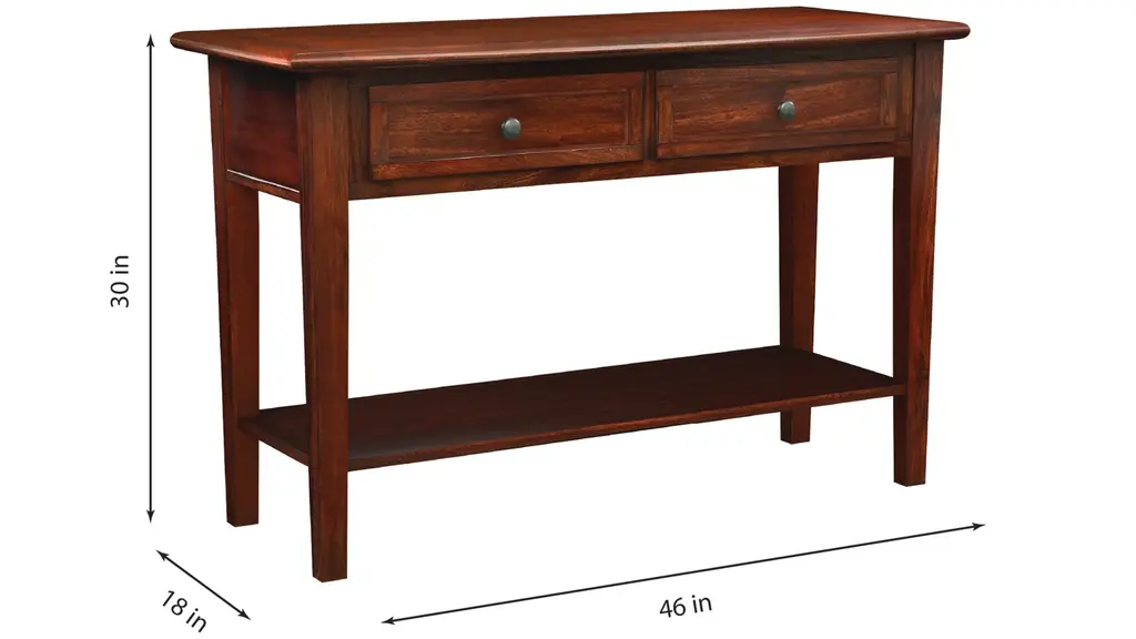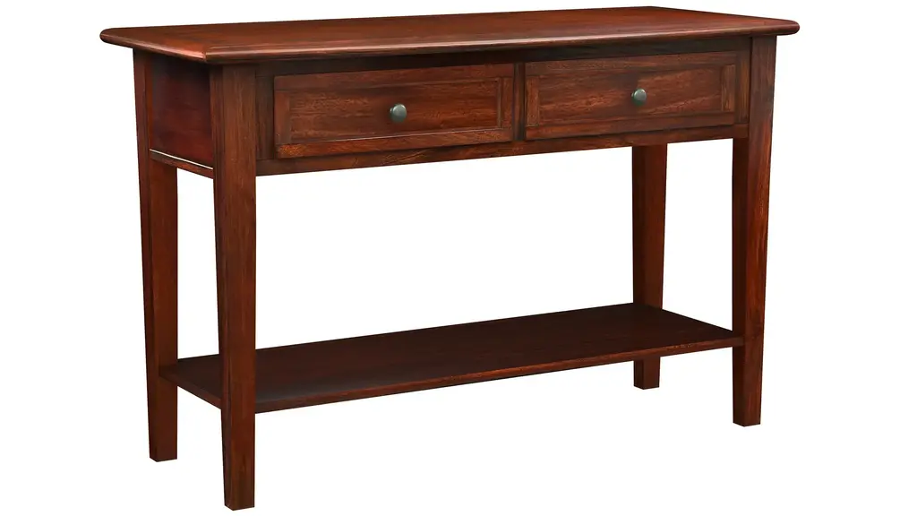 The Westlake Sofa Table blends Shaker-inspired details into its clean, transitional design to create a collection that is full of warmth and personality. Constructed of solid plantation-grown mahogany and finished in an 11-step cherry brown finish, the Westlake incorporates classical construction methods to ensure its allure goes well beyond the surface. Each table in this collection is constructed with a full bottom shelf. The sofa table has 2 drawers with English dovetail construction, solid drawer boxes, full extension metal drawer glides, and corner block braces for increased durability.