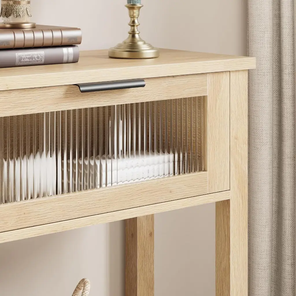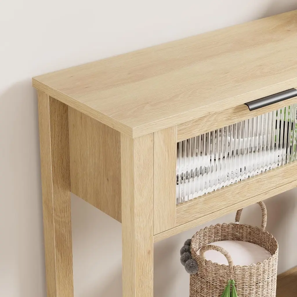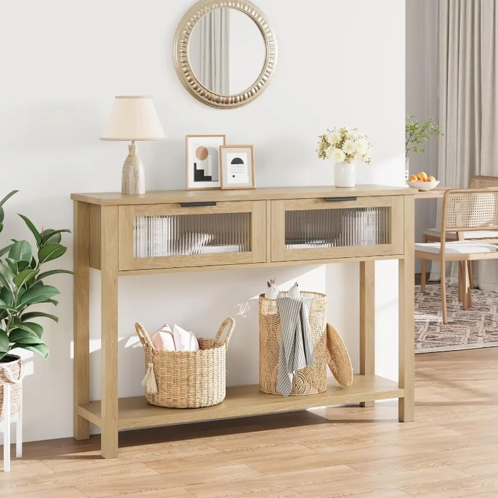 Wood Console Table With 2 Glass Drawers, 2-tier Entryway Table With Storage Shelf, Foyer & Living Room Sofa Table, Natural