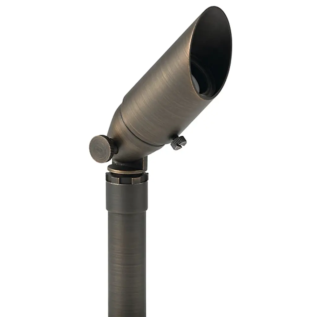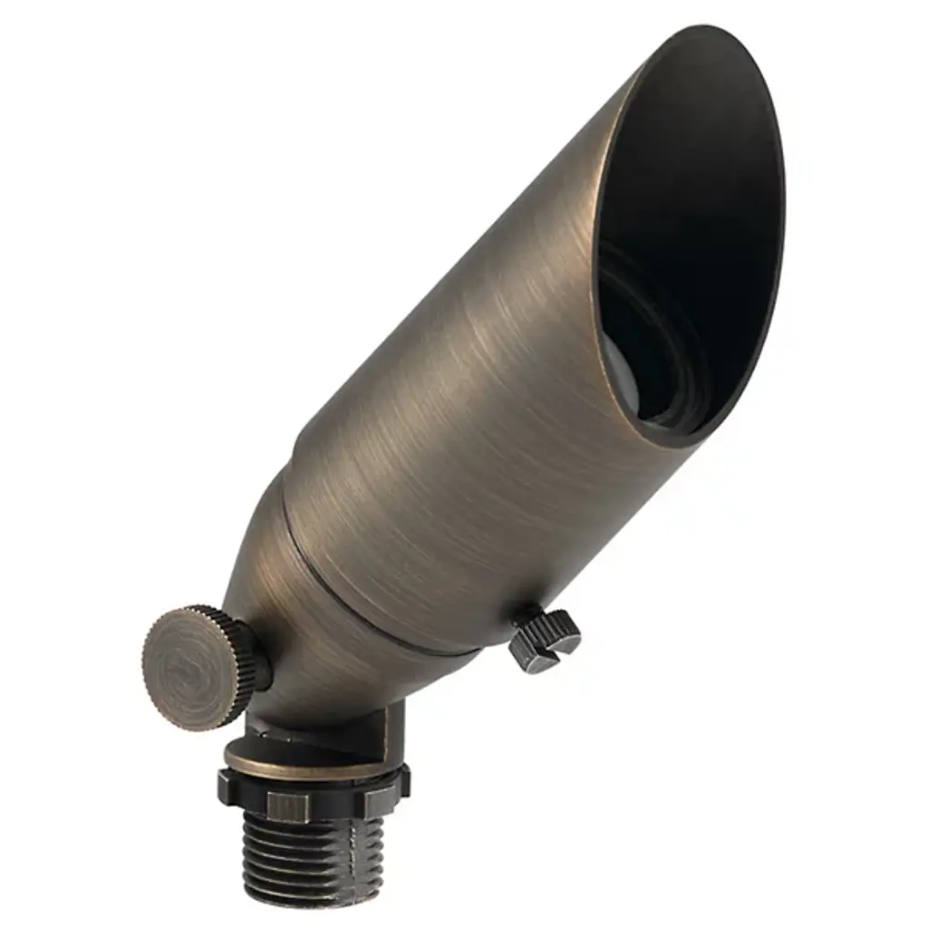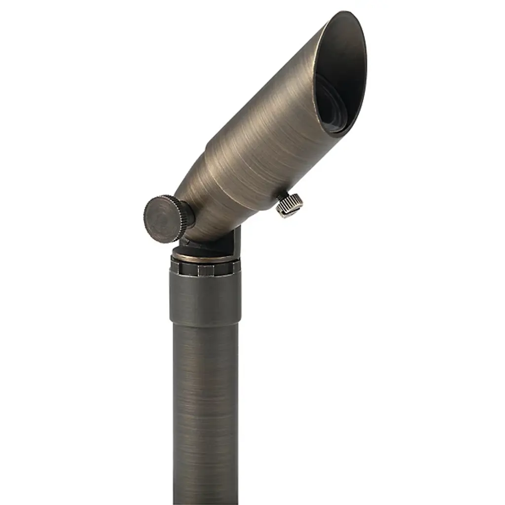 The 12V Adjustable Outdoor Spotlight by Kichler offers a durable, Solid Brass landscape feature to highlight tree clusters, walls, plants and more. A sleek, bullet-shaped lamp head fires a crisp, warm beam of light while a clear tempered Soda Lime Glass lens remains strong throughout the rainy and wet seasons. Line multiple spotlights throughout your landscape space for a brighter and safer outdoor experience.