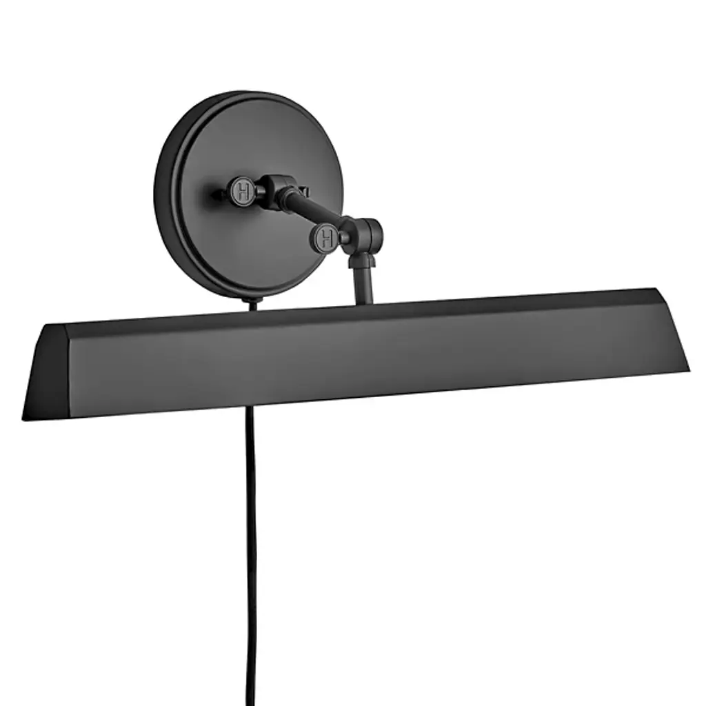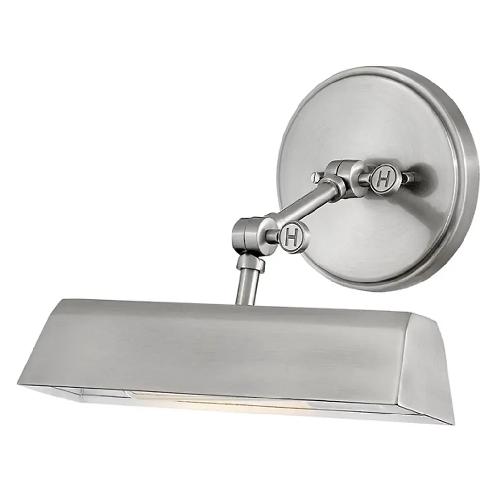 Make an impact on indoor illumination with the fabulous, flexible form of the Arti Accent Light from Hinkley Lighting. An elegant, adjustable fixture in strong steel that embodies intricate transitional design principles, it extends short, posable arms from a stepped disc wall plate, seating bold lamping beneath a broad, hooded shade with an open base. Ideal for illuminating wall art indirectly, the shade arrangement artfully eliminates glare to the sides, transmitting a mix of reflected wall wash and direct downlight below.