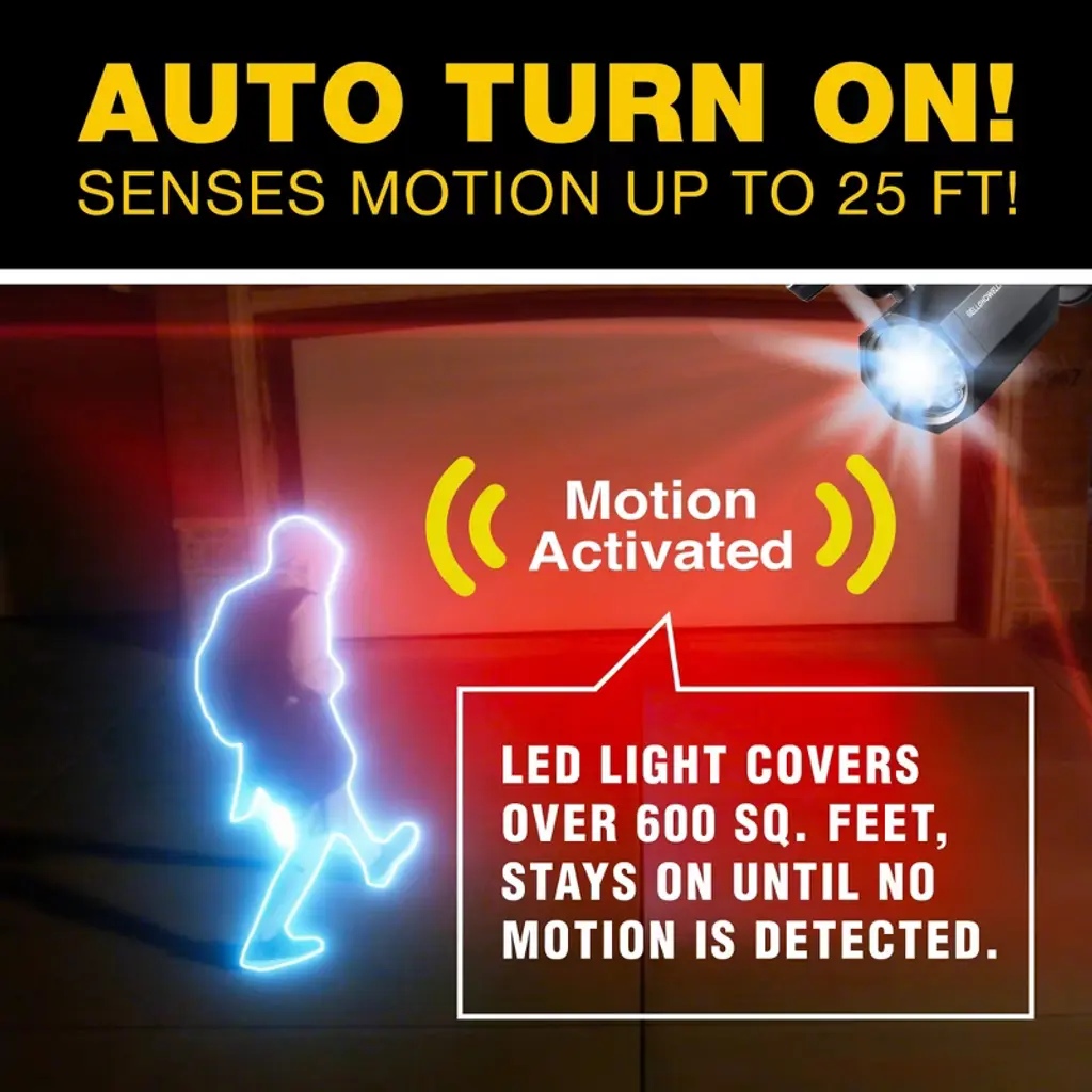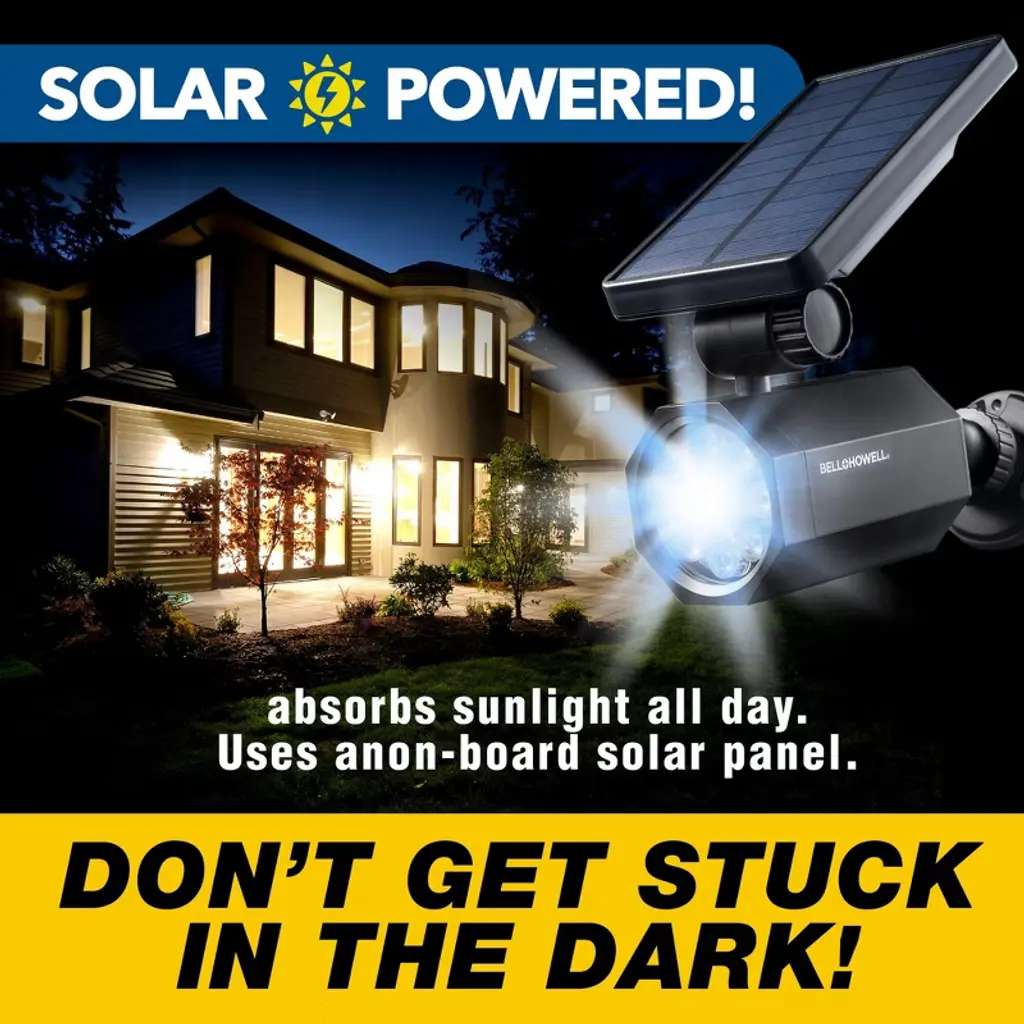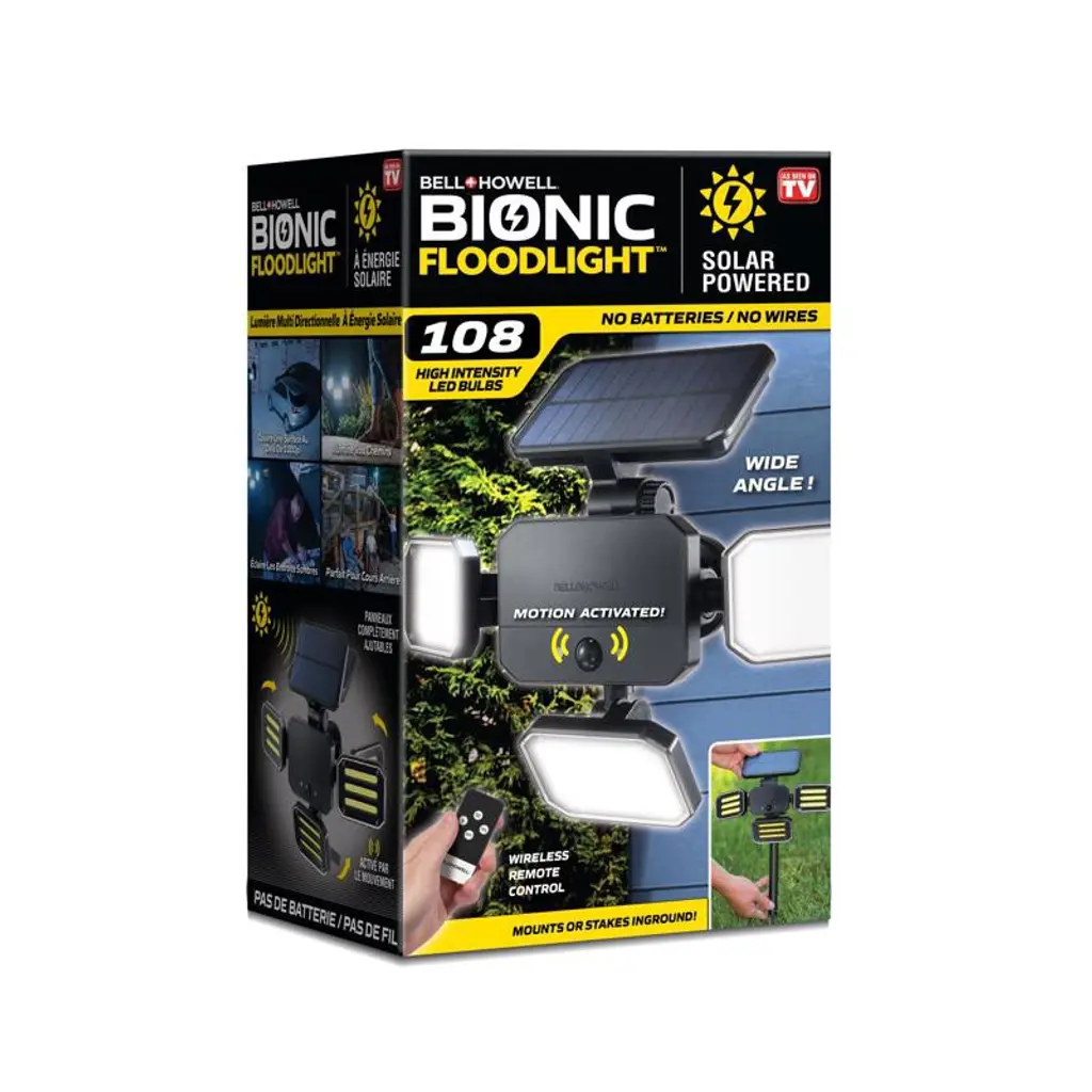 Brighten up dark outdoor spaces with the Bell + Howell Bionic Spotlight Deluxe, a solar powered outdoor motion sensor light engineered for safety, convenience, and eco-conscious performance. This powerful LED spotlight features 8 ultra-bright lights that illuminate over 600 sq. ft., detecting motion up to 25 feet with a wide 100° sensor angle. Powered by sunlight, it requires no wiring or batteries, making installation effortless with the included mounting plate and ground stakes. Designed for durability, it withstands heat, frost, and rain—perfect for lighting up yards, walkways, gardens, stairs, and more. With a 60-second motion-activated timer, 460-lumen output, and sleek swivel design, this security light delivers dependable illumination wherever you need it most.