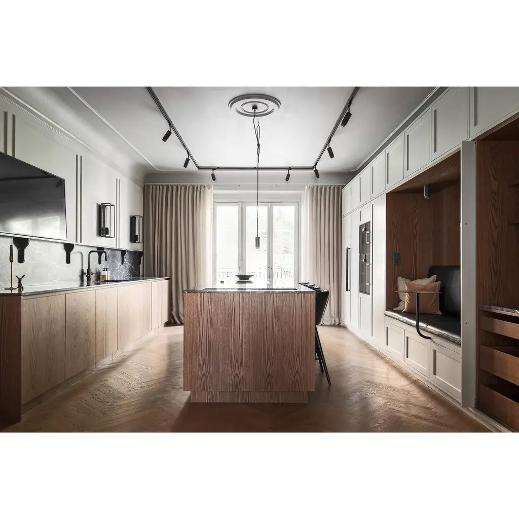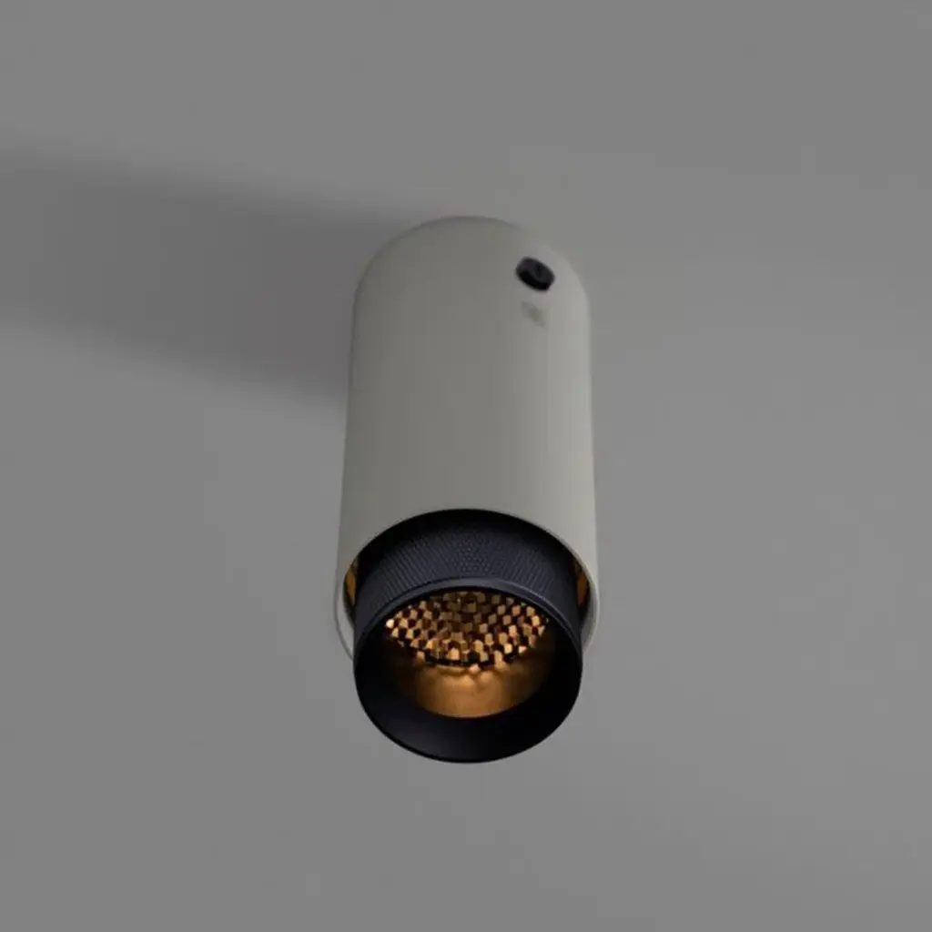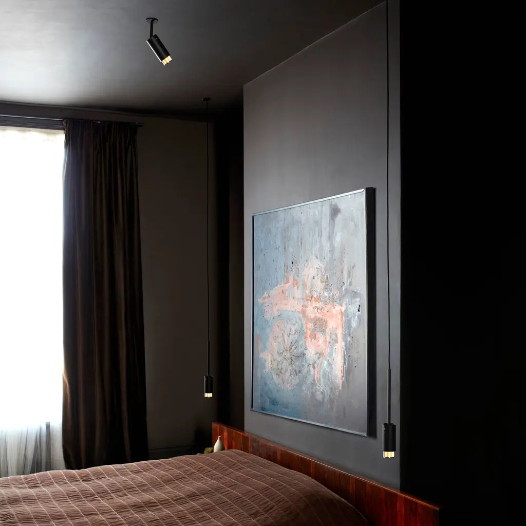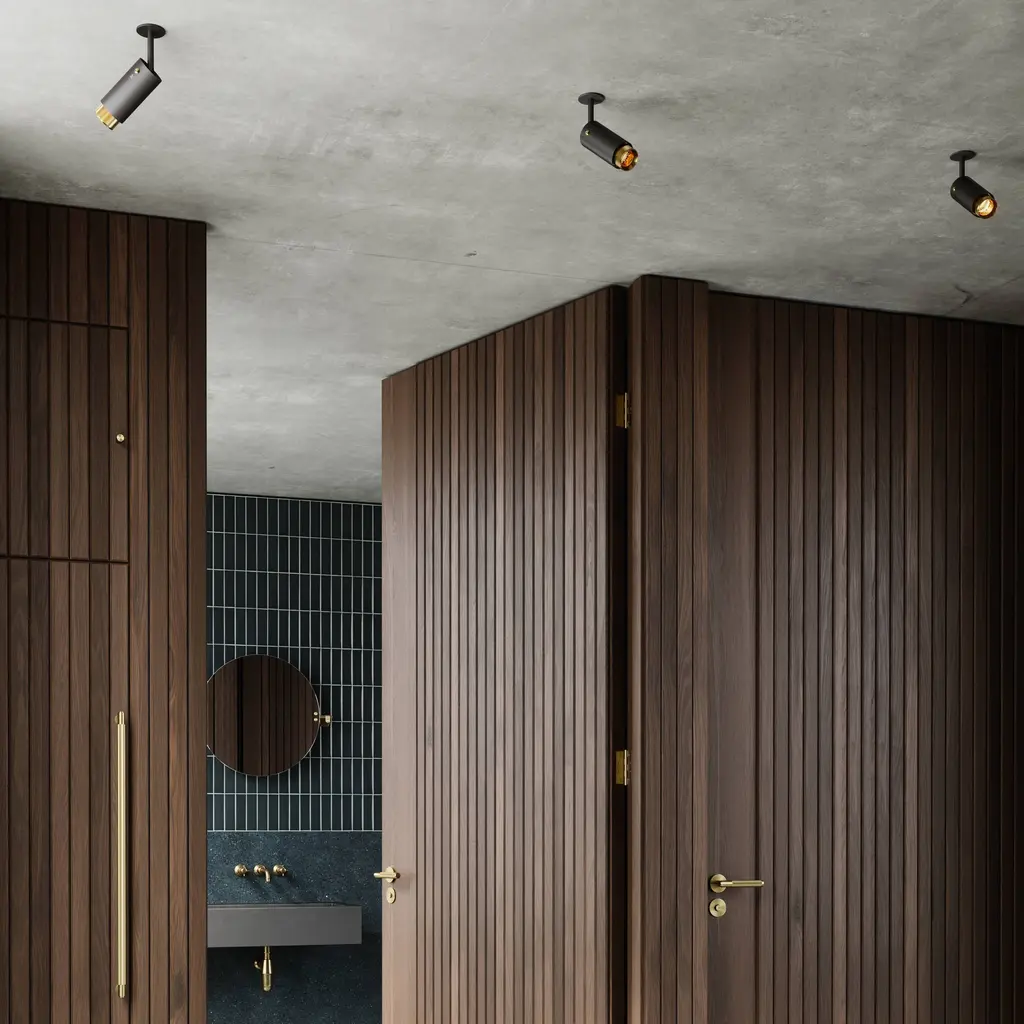 An adjustable spotlight made from graphite powder coated metal with cross-knurled solid metal detailing.