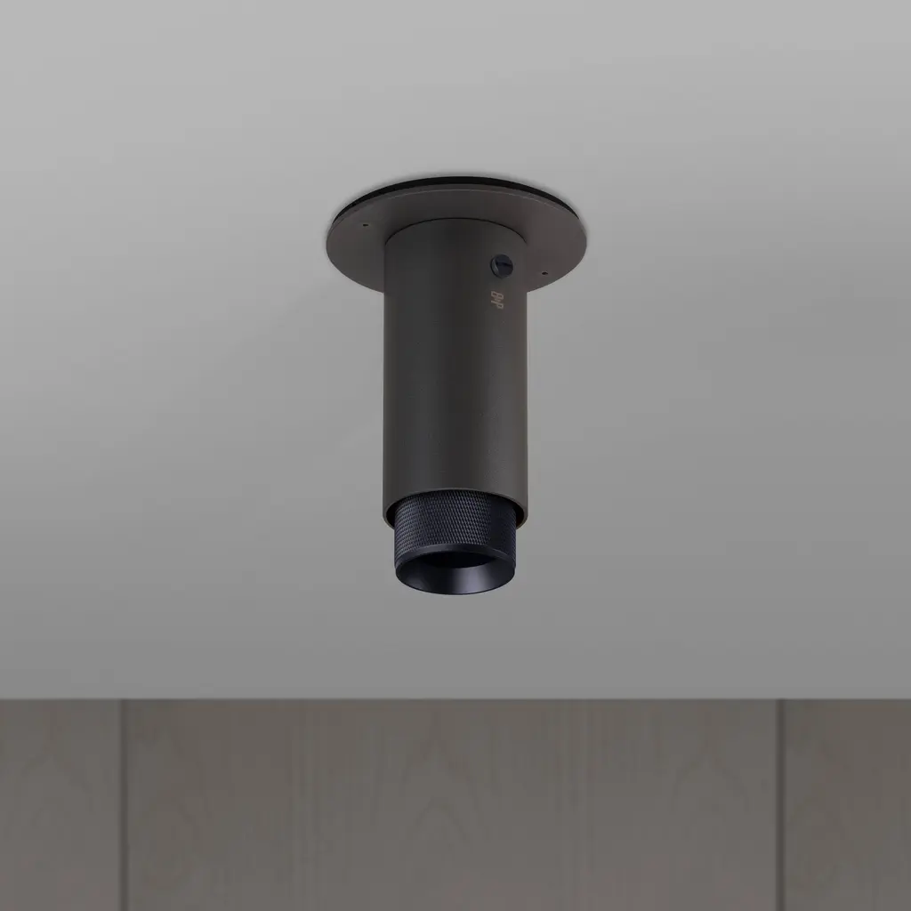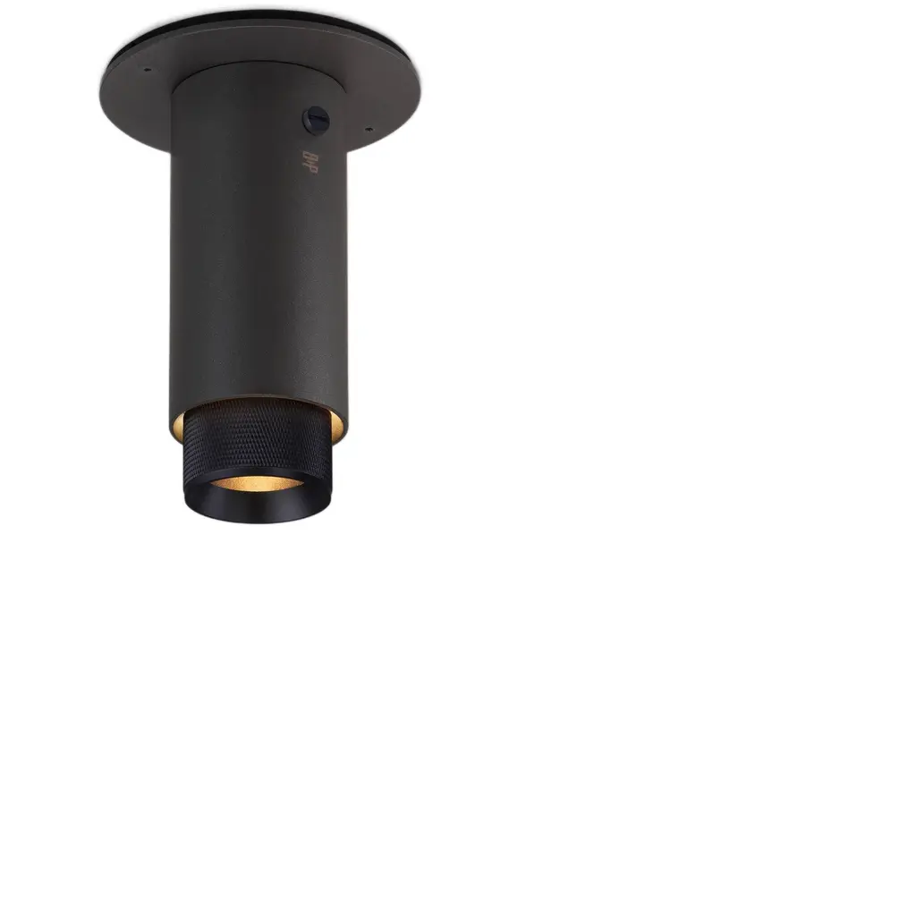 A surface mounted, fixed spotlight made from graphite powder coated metal with solid gun metal detailing.