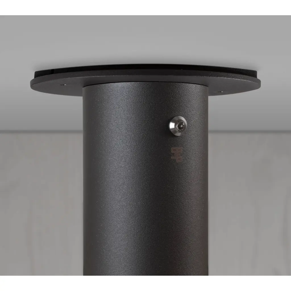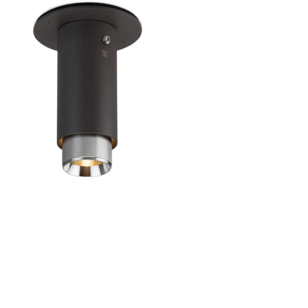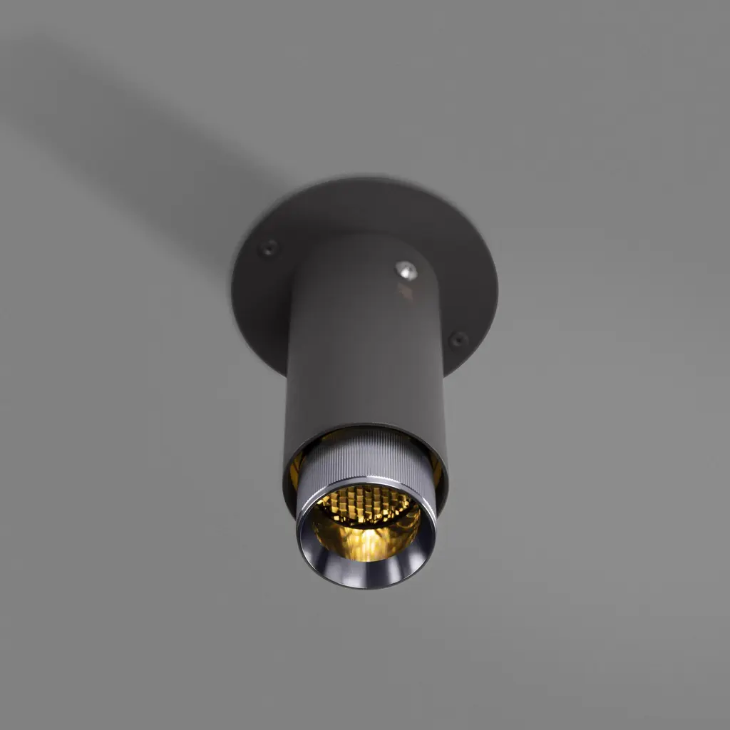 A surface mounted, fixed spotlight made from graphite powder coated metal with linear-knurled solid metal detailing.
