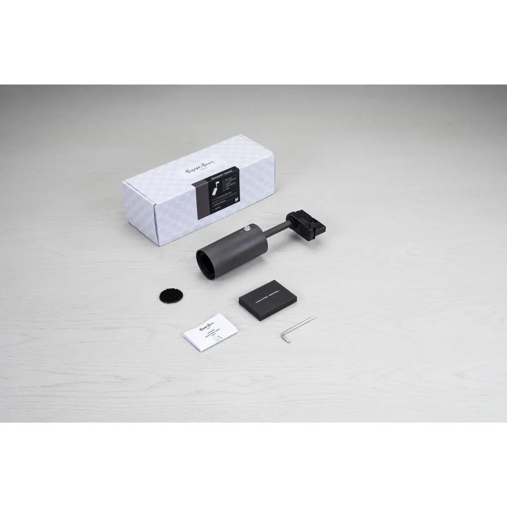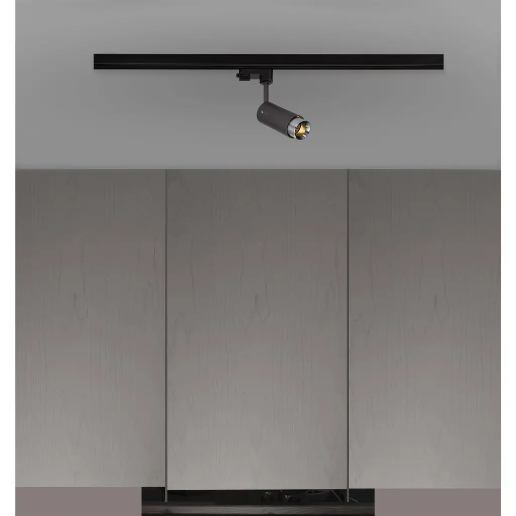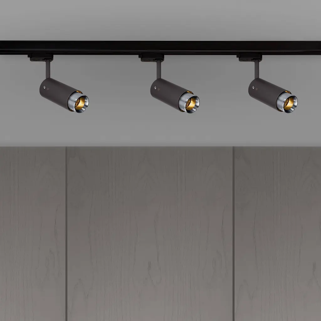 A track spotlight made from graphite powder coated metal with linear-knurled solid metal detailing.